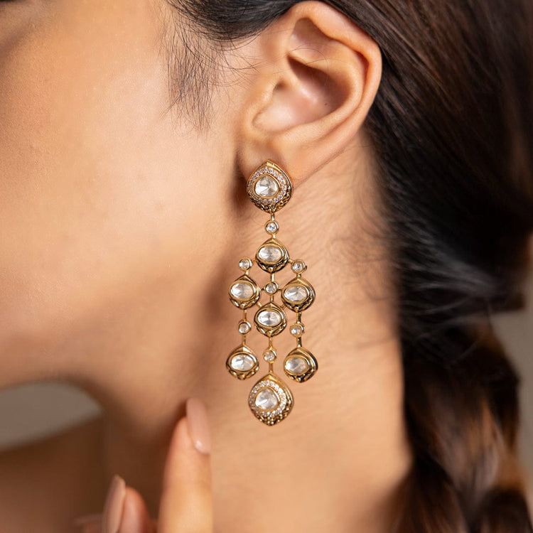 Description: Richly detailed and accented with golden peach-toned beads, these earrings blend kundan sparkle with festive vibrance. A graceful choice for bridal parties or celebratory wear.