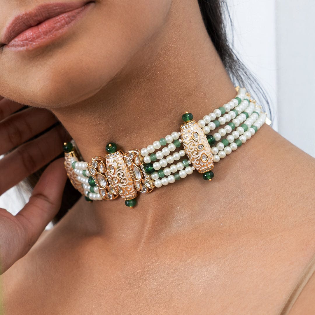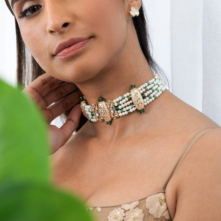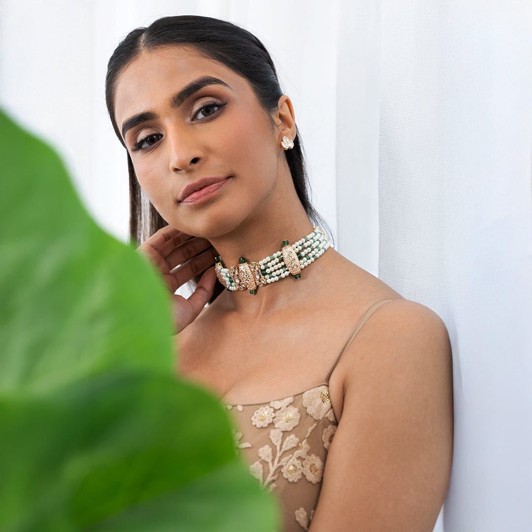 We use 22K Micron Gold Plating on brass, paired with high quality pearls, precious carved beads, semi precious stones, intricately hand painted with enamel, exquisite high quality pearls and high quality kundan that are celebrated for their durability and refinement - making every Joules by Radhika creation a piece that radiates brilliance and sophistication.