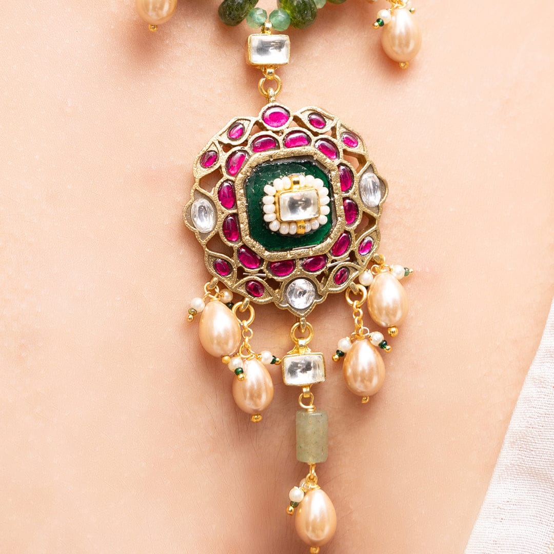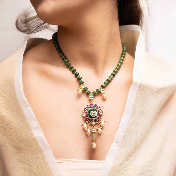 Description: This green beaded necklace centers around a bold round pendant adorned with polki-style stones and pearl detailing. A regal choice for brides or traditional functions with a touch of vintage grace.