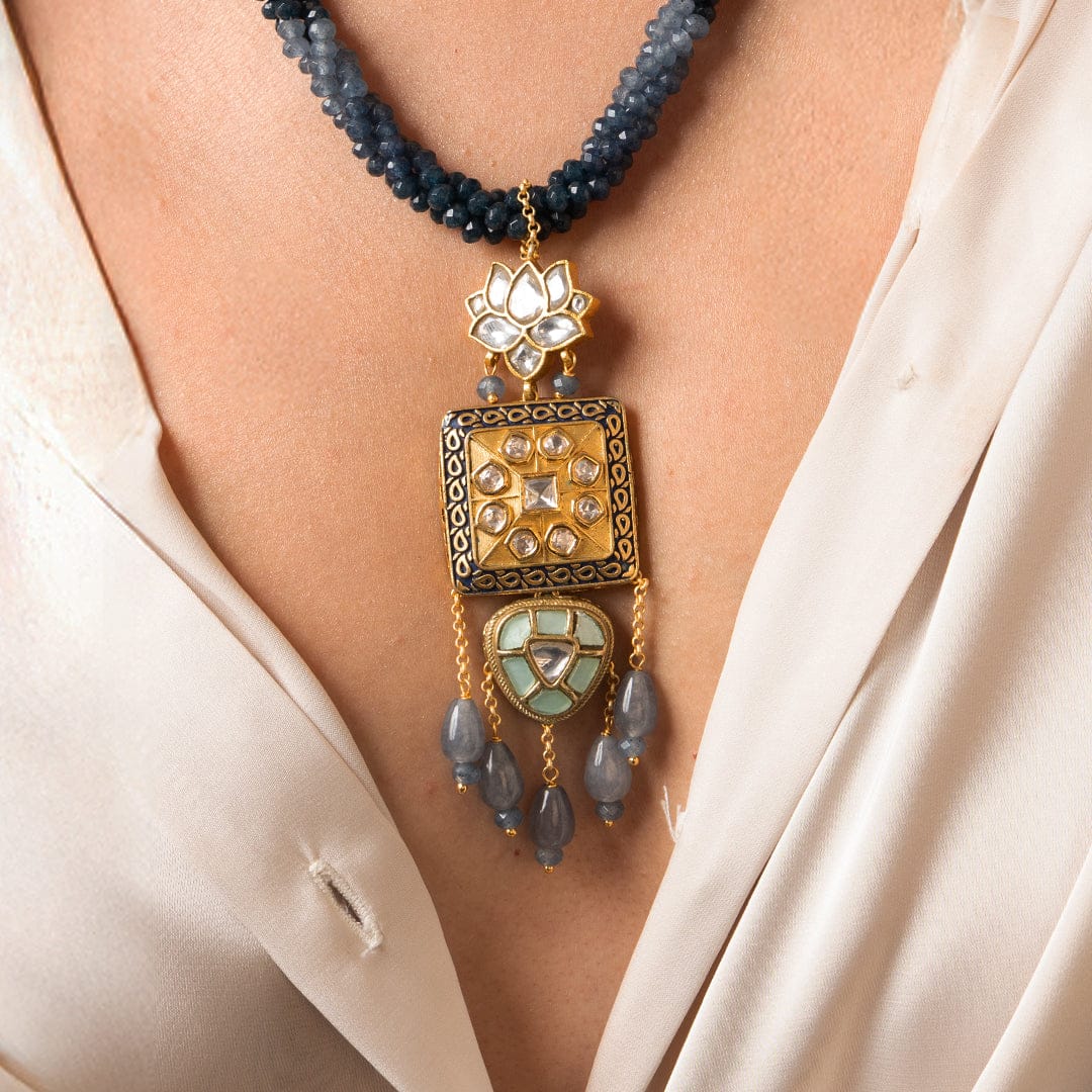 Description: This stunning Indian Jewellery necklace features a twisted two-tone beaded chain and an ornate rectangular pendant. Blue accent drops complete this unique and fashionable piece from Ahaanya.
