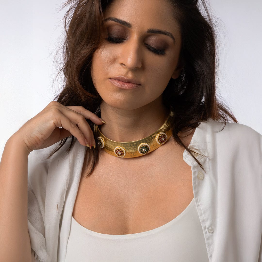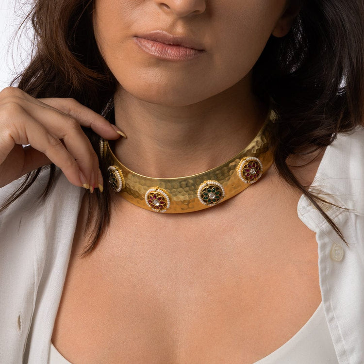 Description: This wide, elaborate statement piece of Indian Jewellery features a textured surface and stunning circular stone accents. A standout accessory from Ahaanya.