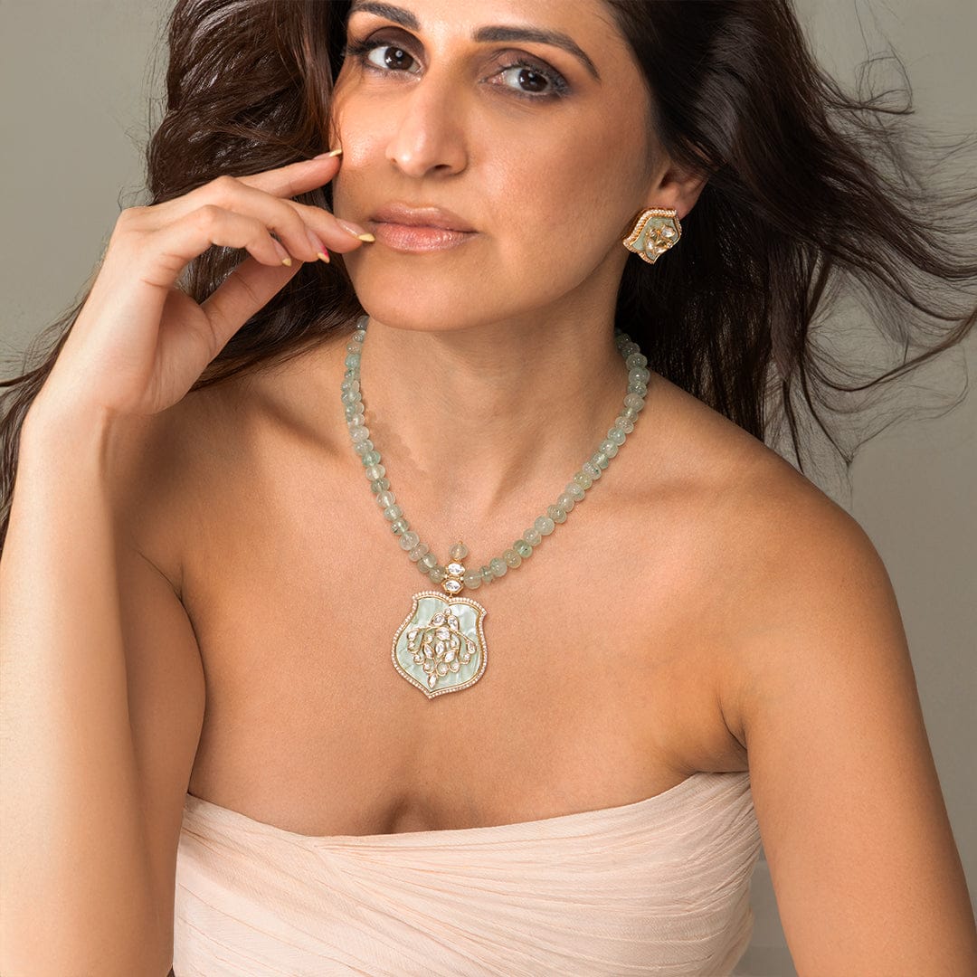 Description: This Indian Jewellery necklace features a strand of light green beads and a large ornate pendant with pearl accents. The matching earrings complete the cohesive look from Ahaanya.