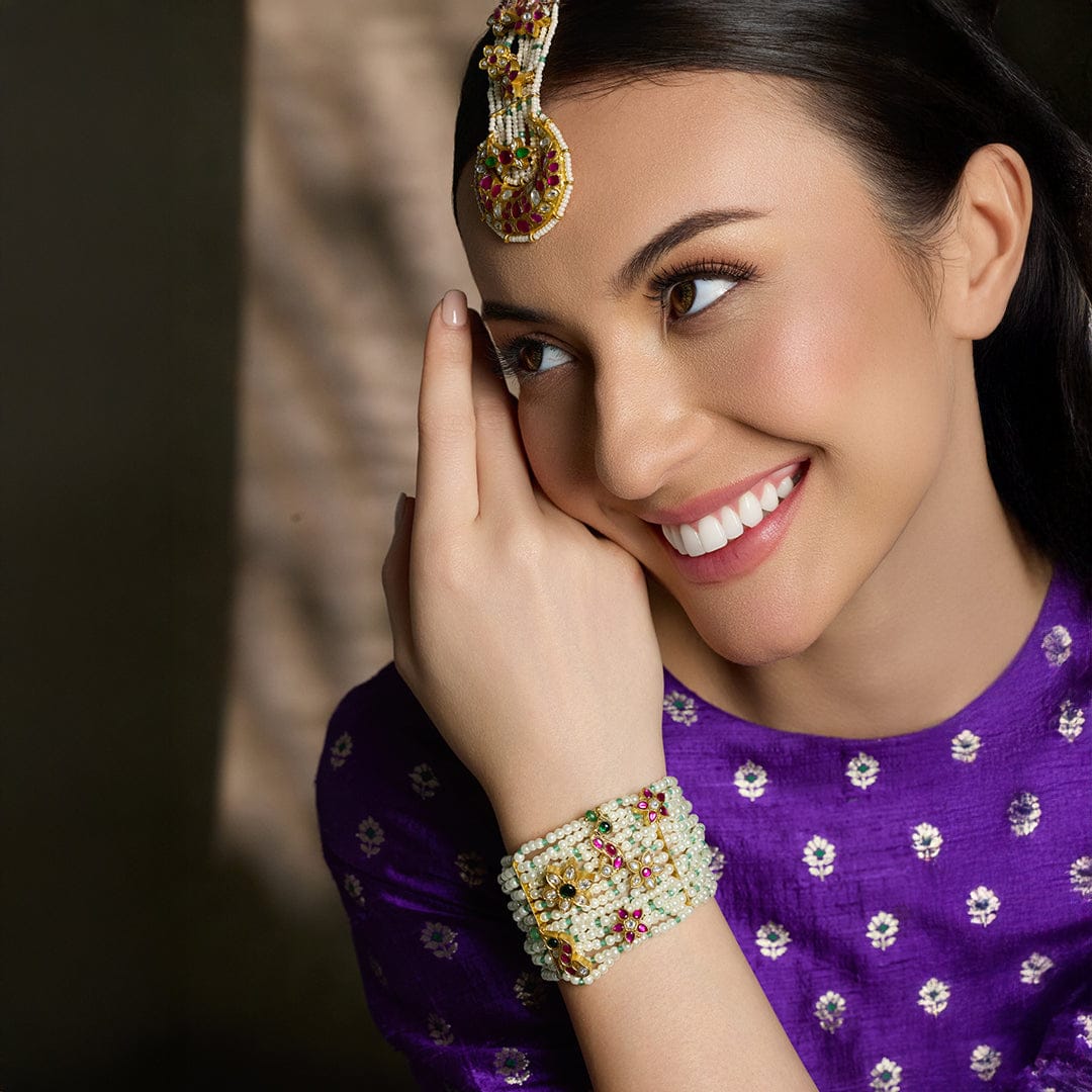 We use 22K Micron Gold Plating on brass, paired with high quality pearls, precious carved beads, semi precious stones, intricately hand painted with enamel, exquisite high quality pearls and high quality kundan that are celebrated for their durability and refinement - making every Joules by Radhika creation a piece that radiates brilliance and sophistication.