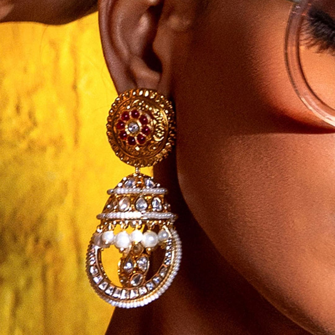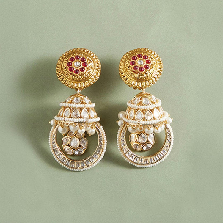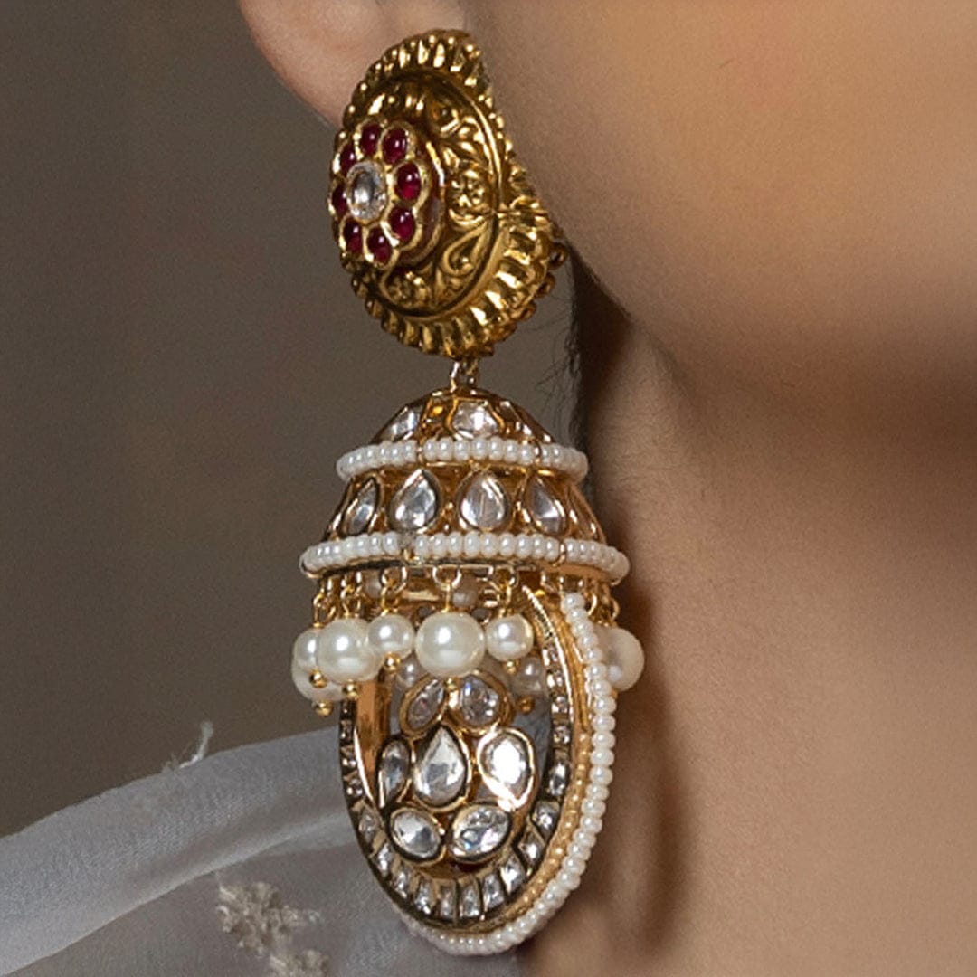Description :Red Antique Rubies Jhumka" - Unleash your inner radiance with our 22Kt Gold Plated earrings. Featuring hydro rubies, hydro polkis, and shell pearls, adorned with intricate brass carvings. Perfect for weddings, celebrations, and special occasions, these earrings blend timeless charm with modern elegance, ensuring you shine at every moment.