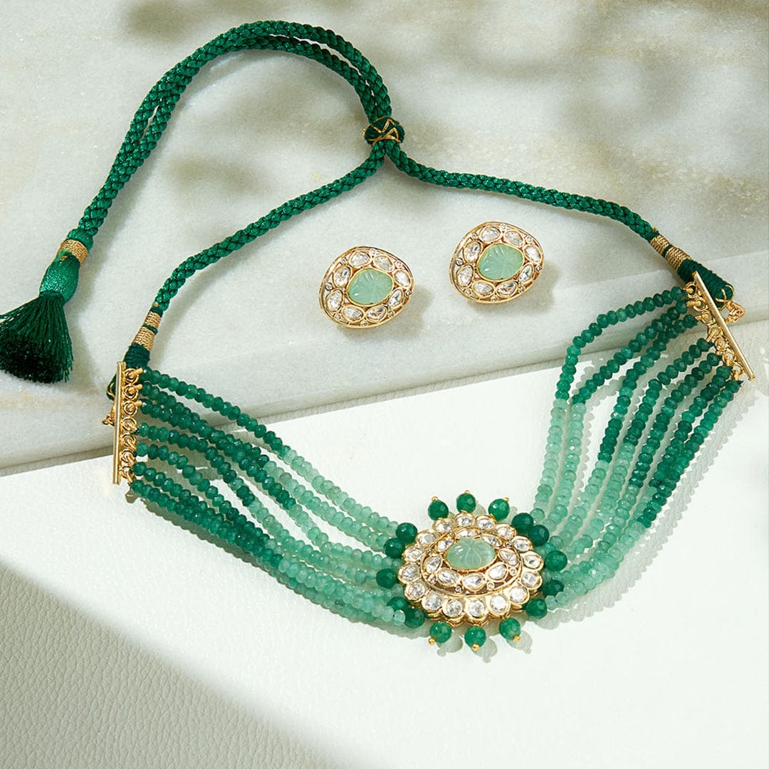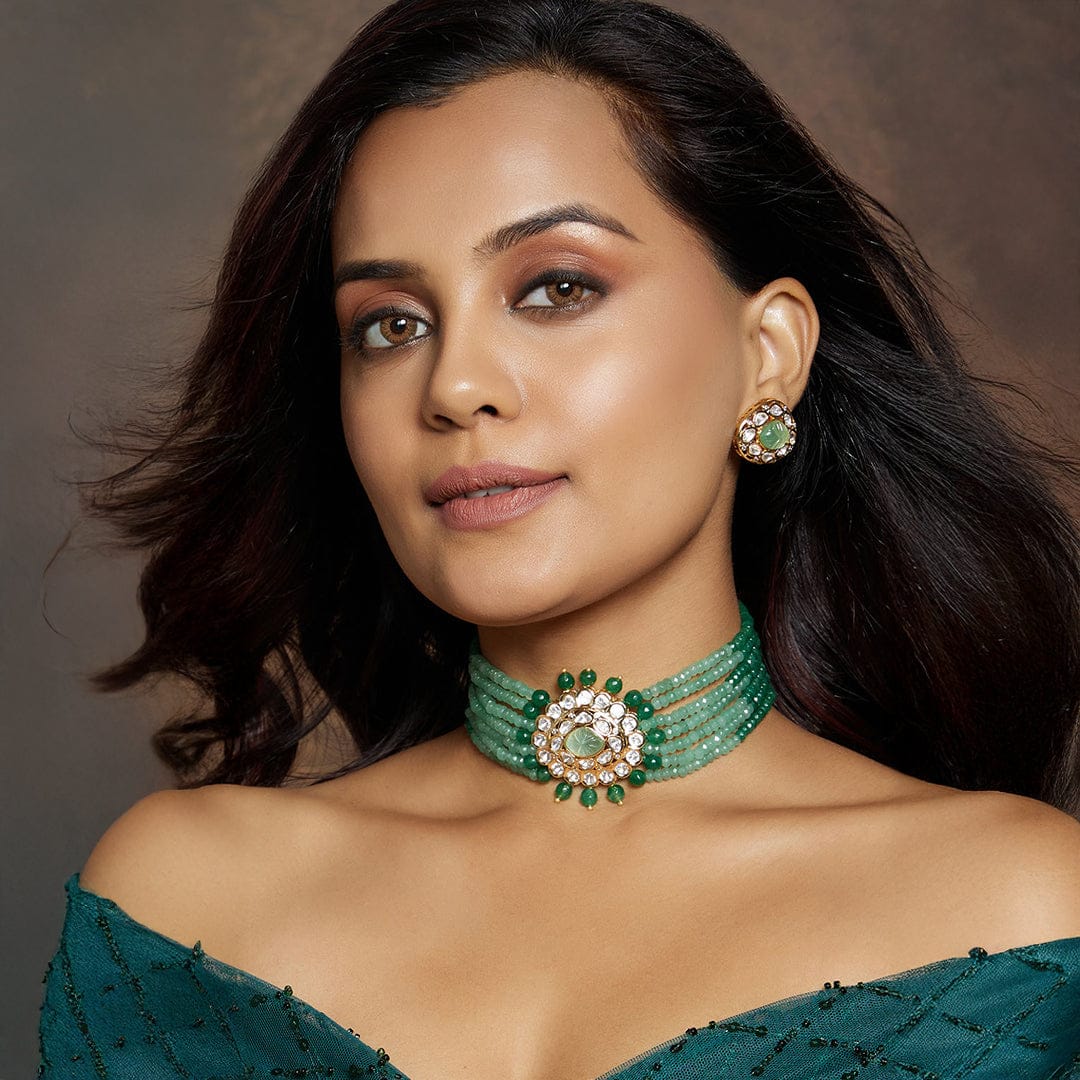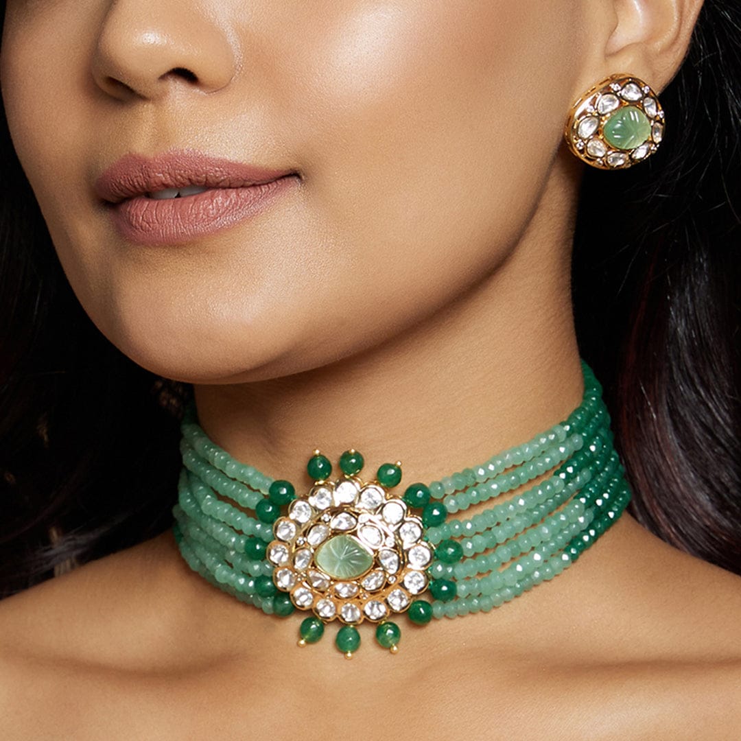 Regular price Rs. 8,175.00Description :Refine yourself with the Multi Shaded Green Polki Choker Set, a handcrafted masterpiece featuring kundan polki beads, green agates, and a carved monalisa stone center. Perfect for festive, wedding, and party occasions with Indian & fusion attire. Each piece from Joules by Radhika is crafted with real semi-precious stones, exuding regal elegance. The adjustable locking system ensures a perfect fit for all neck sizes.