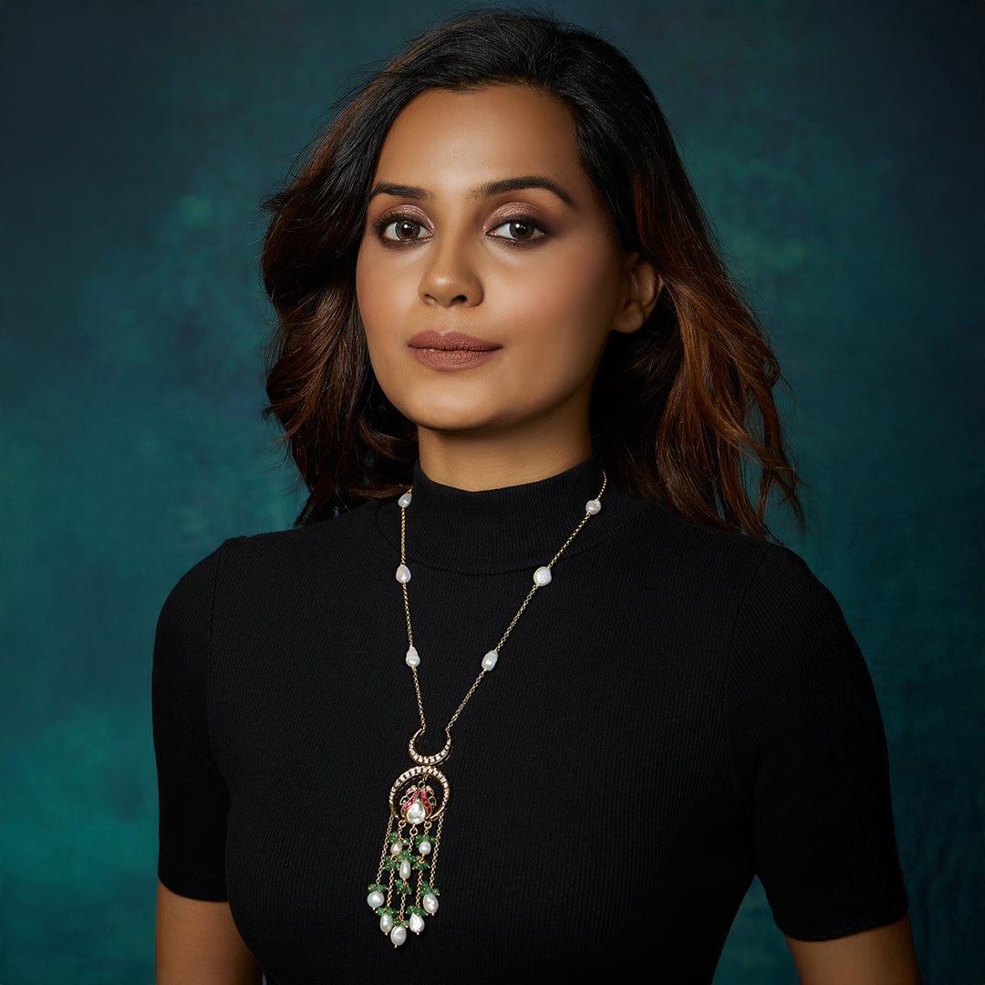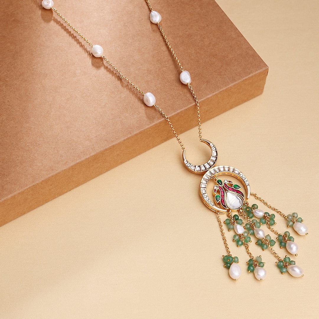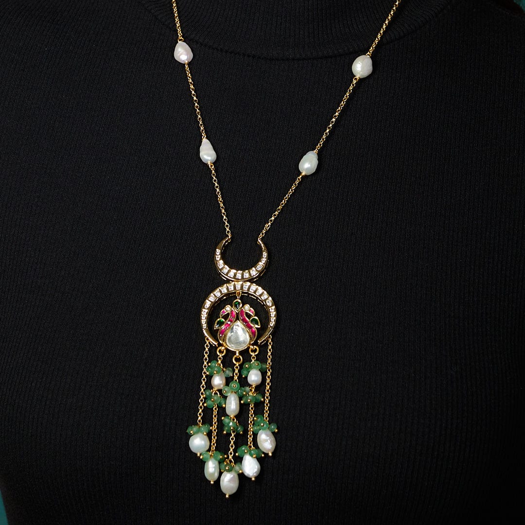 Regular price Rs. 4,140.00Description: Placate in opulence with the Kundan Polki Red And Green Long Necklace from Joules by Radhika. This designer marvel boasts a gold-finished pendant adorned with mesmerizing polkis and cascading fresh water pearls, elegantly interwoven with micro gold-plated brass chains. Elevate your daily indo-western style, as each piece exudes regality through real semi-precious stones. Make a statement in , DesignerJewelry, embrace , FusionFashion, and unveil a , RegalLook with the enchanting , KundanPolkiNecklace featuring exquisite , SemiPreciousStones.