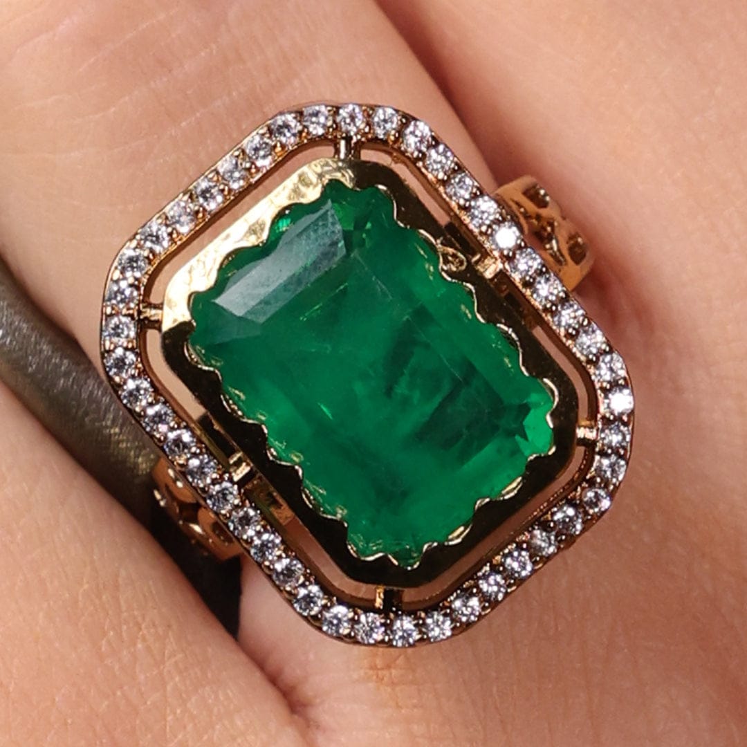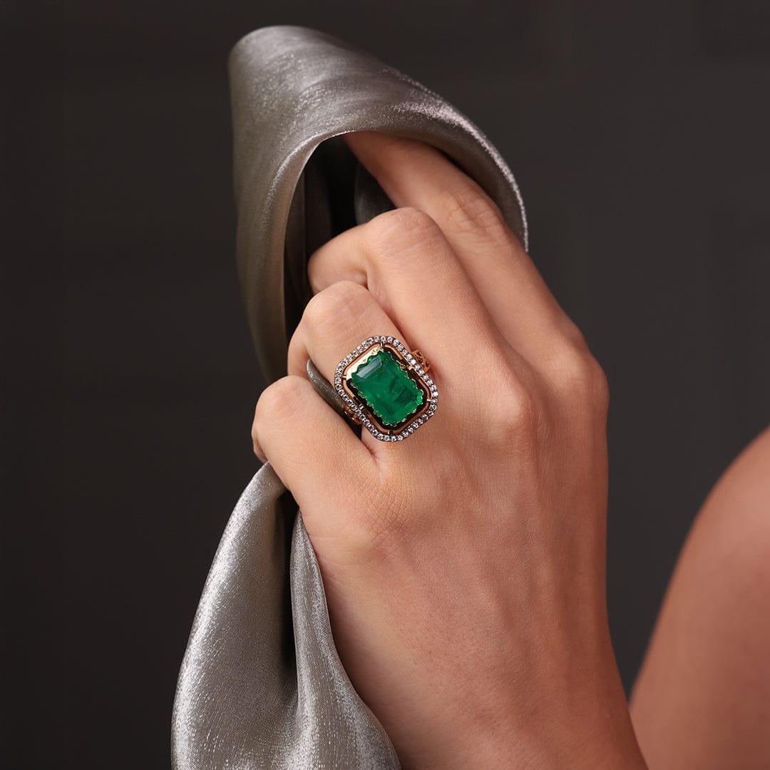 Description : With a glowing emerald centrepiece and royal design, the Regal Emerald Royale Ring showcases heritage elegance. Perfect for festive wear, this ring adds a luxurious touch to any look.