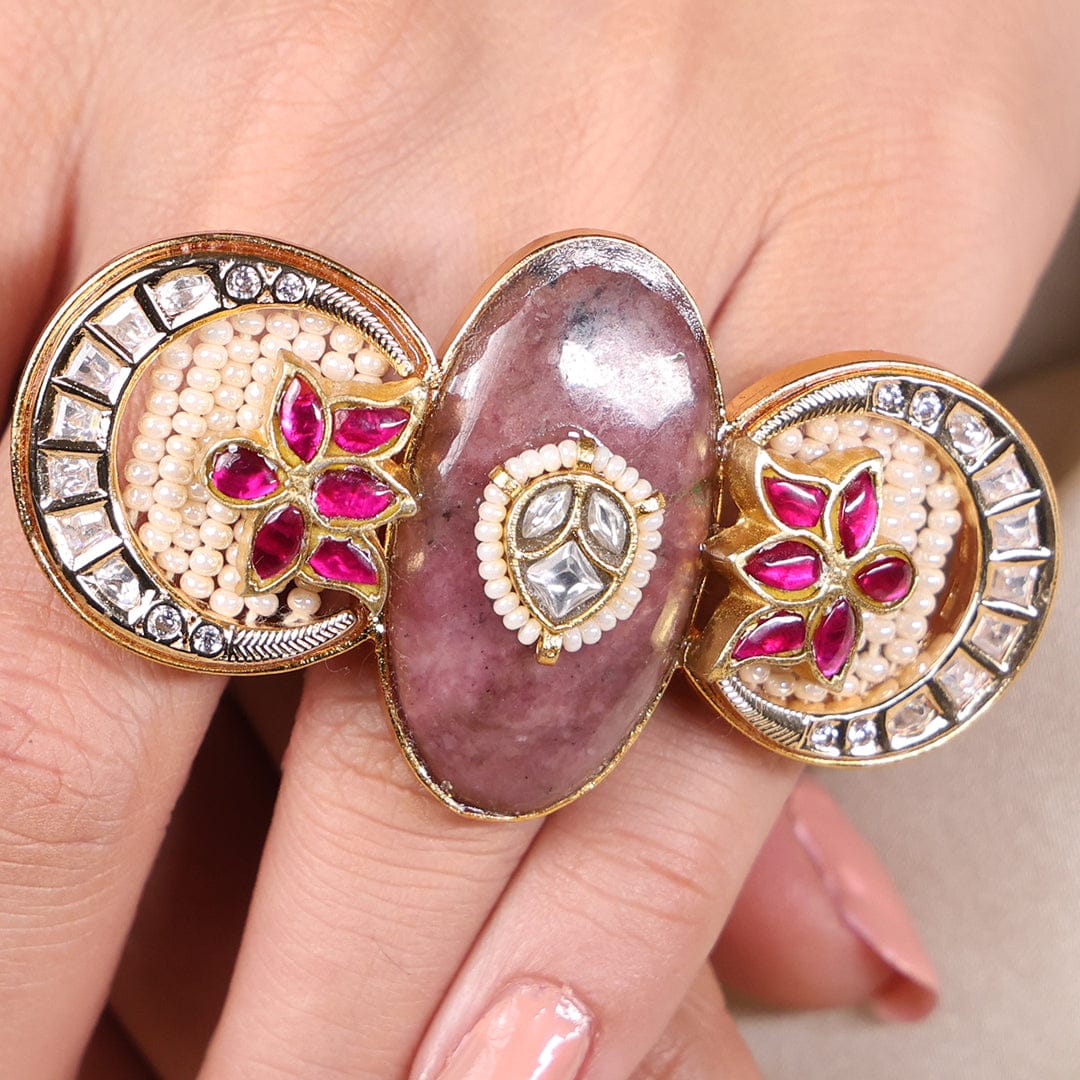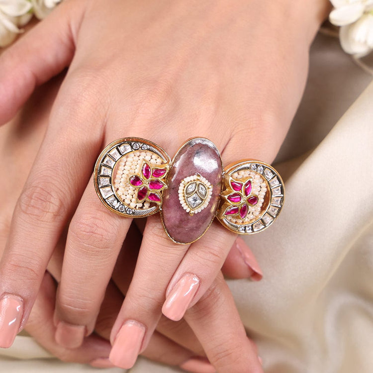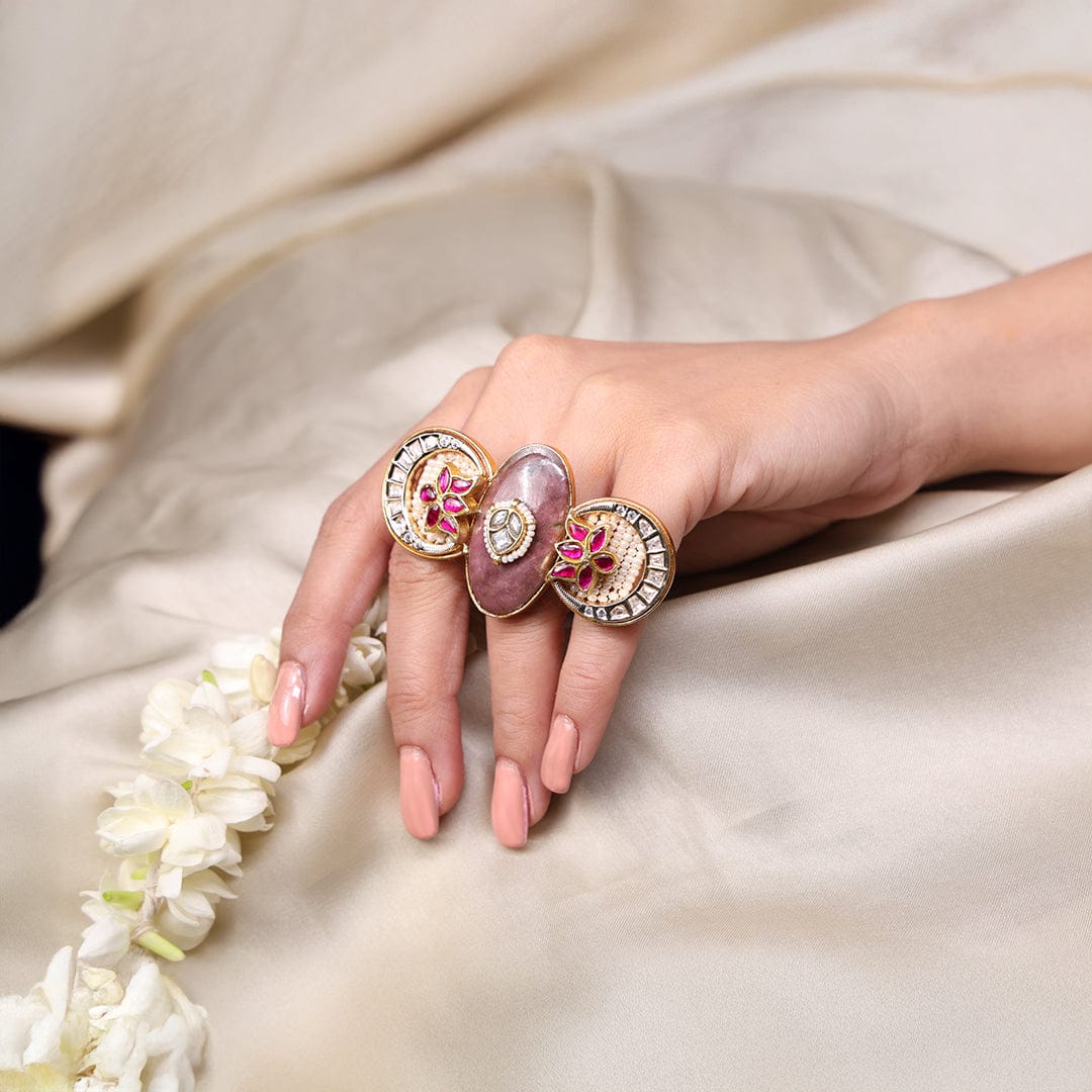 Description : ShopJBR featuring a radiant ruby stone and intricate kundan detailing, the Ruby Blossom Ring glows with royal charm. A perfect choice for weddings, festivities, or elegant gatherings with traditional attire.