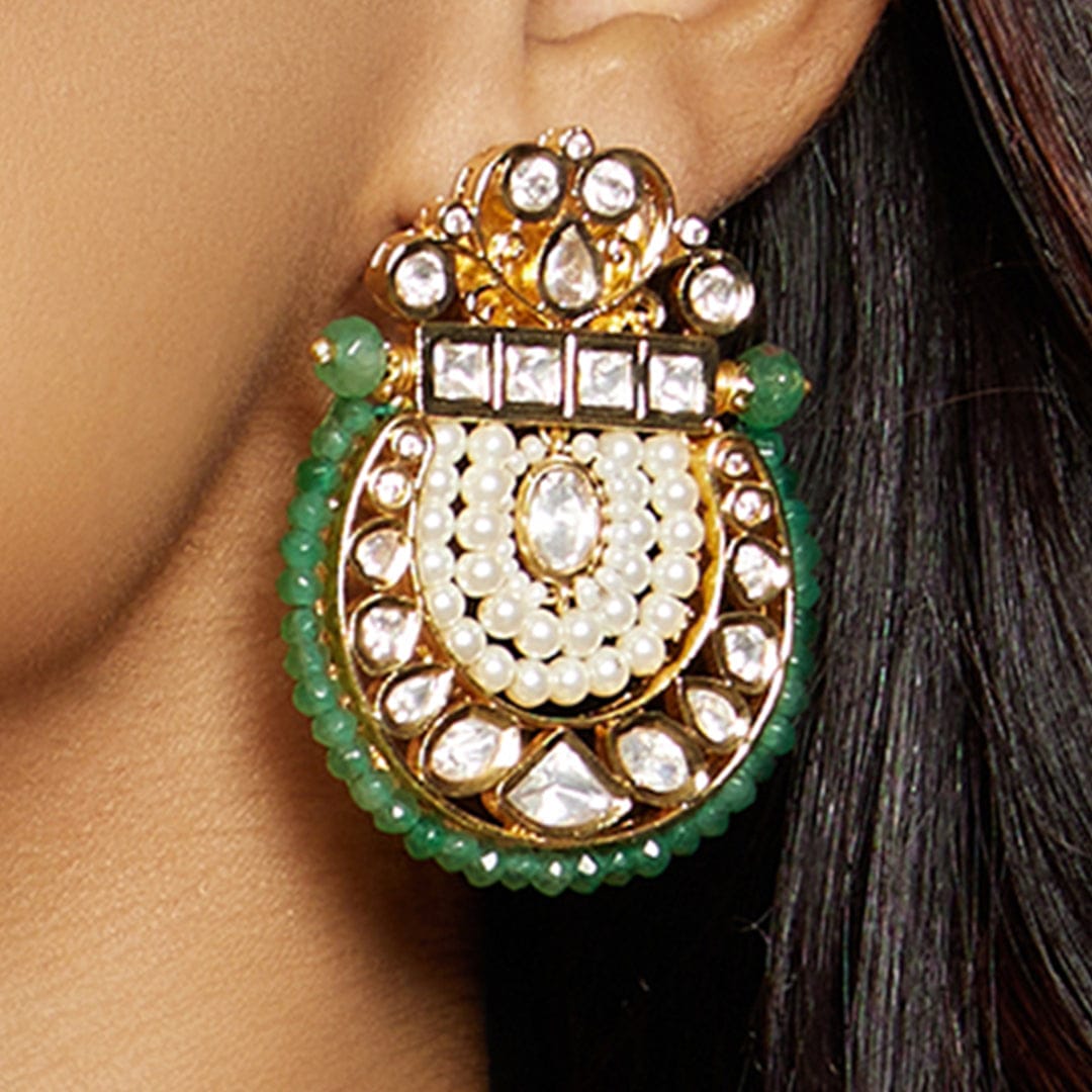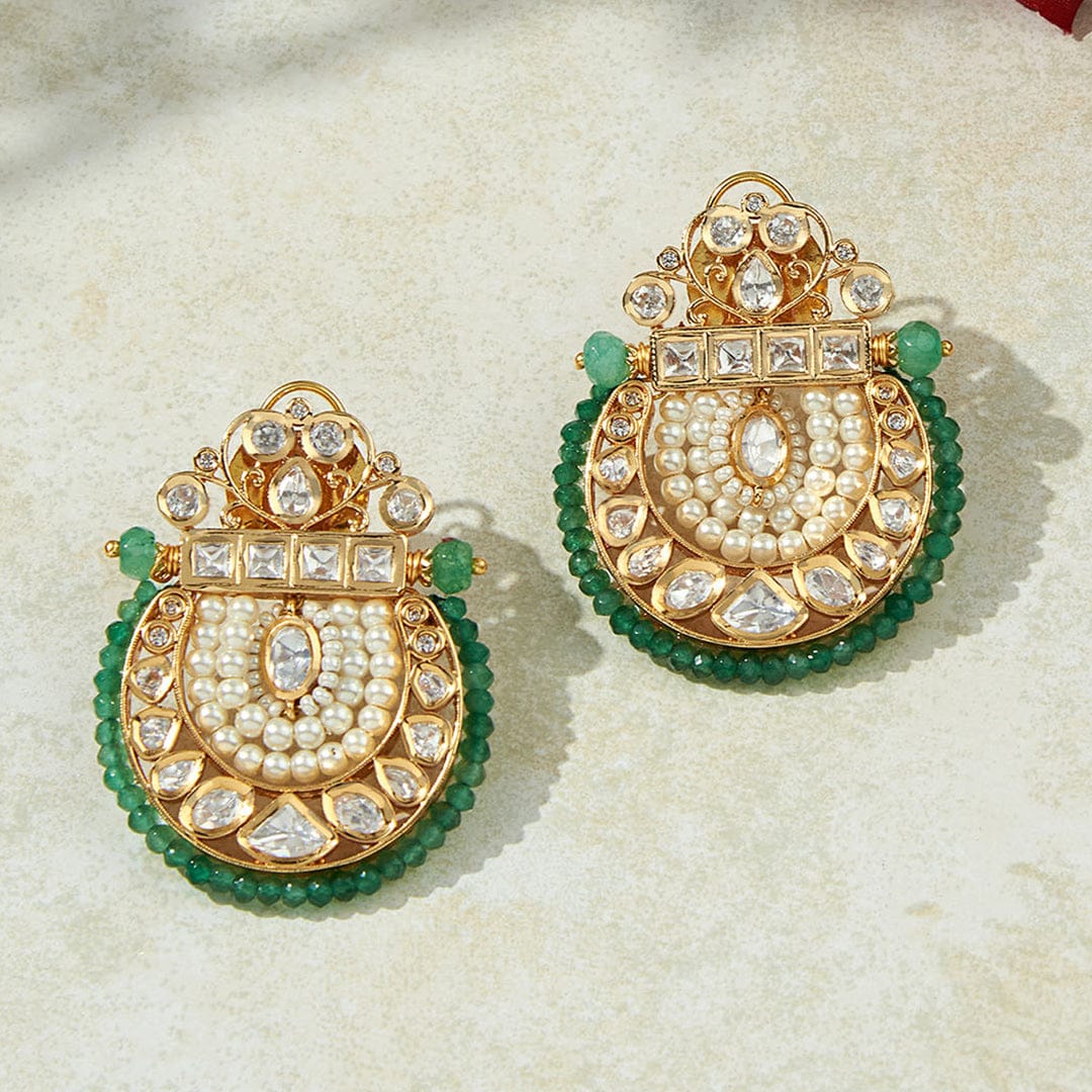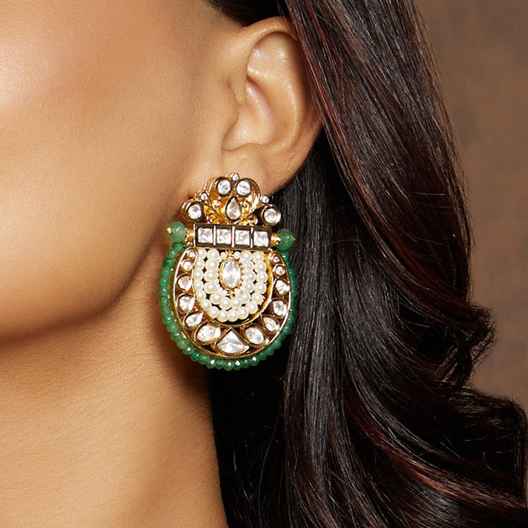 Regular price Rs. 6,650.00Description :Glorify in opulence with Kundan Polki Pearl Earrings from Joules by Radhika. Meticulously handcrafted, these earrings blend multi-shaped polkis, classic pearls, and a lush border of green cut agate beads. Elevate your style for festive, wedding, and party extravaganzas, seamlessly blending with Indian and fusion ensembles. Each piece exudes regality, embodying the allure of real semi-precious stones.