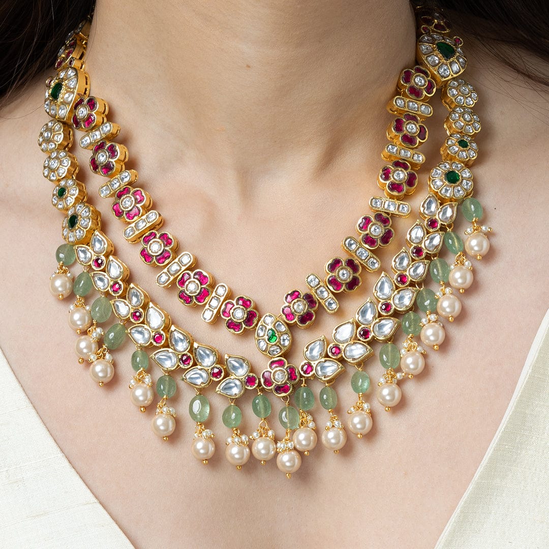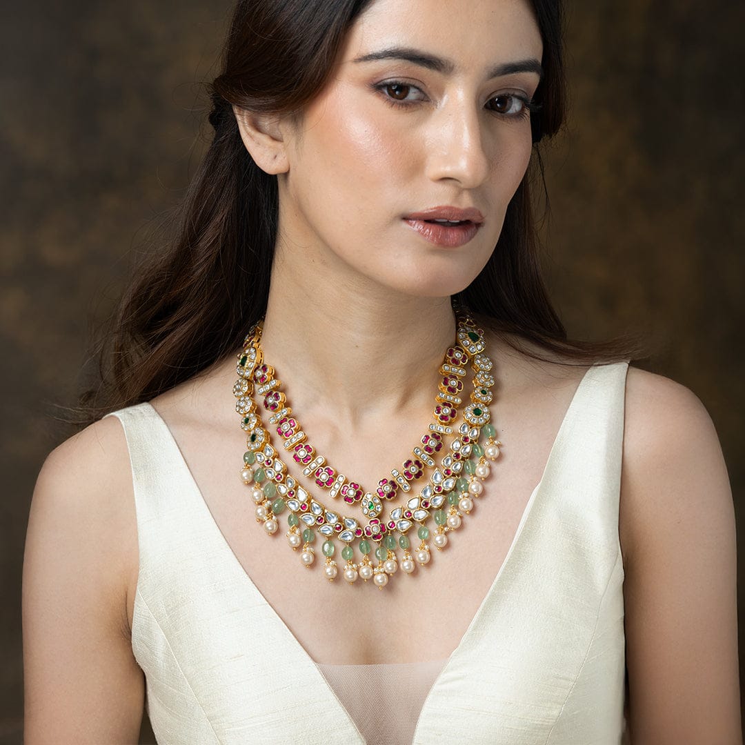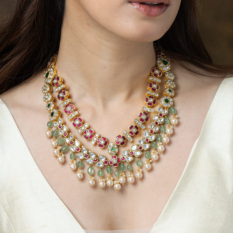 We use 22K Micron Gold Plating on brass, paired with high quality pearls, precious carved beads, semi precious stones, intricately hand painted with enamel, exquisite high quality pearls and high quality kundan that are celebrated for their durability and refinement - making every Joules by Radhika creation a piece that radiates brilliance and sophistication.