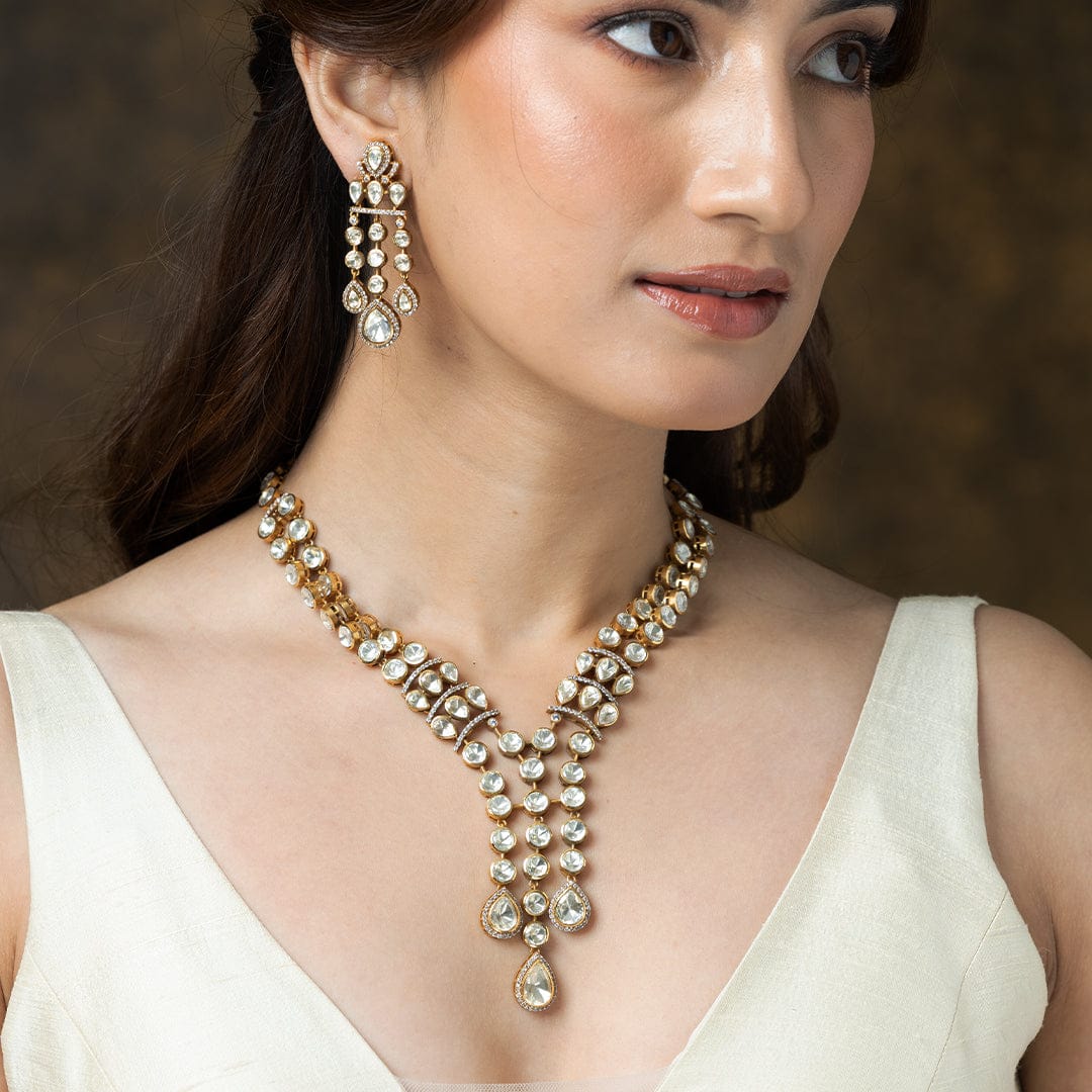 Description: This elegant necklace set features multiple flowing strands of luminous small pearls that converge into dangling pearl clusters at the center. Its subtle grace makes it a timeless and perfect choice for gifting.