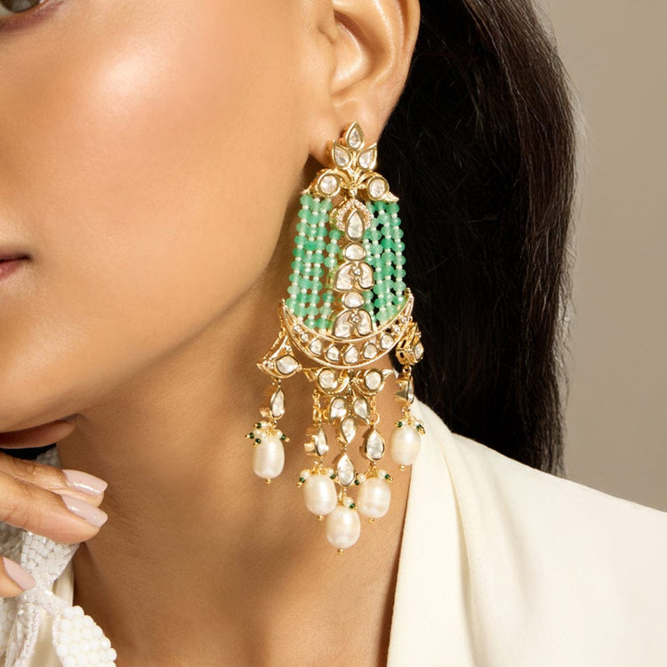 Regular price Rs. 7,088.00Description: Pearl Garden Dangles bring together the classic allure of polki and pearls with a fresh touch of green beads. These earrings offer a perfect blend of tradition and modern elegance, with pearls gently cascading from a polki-studded base and vibrant green beads adding a lively finish. Ideal for both festive celebrations and formal events, they are designed to enhance your look with grace and charm.