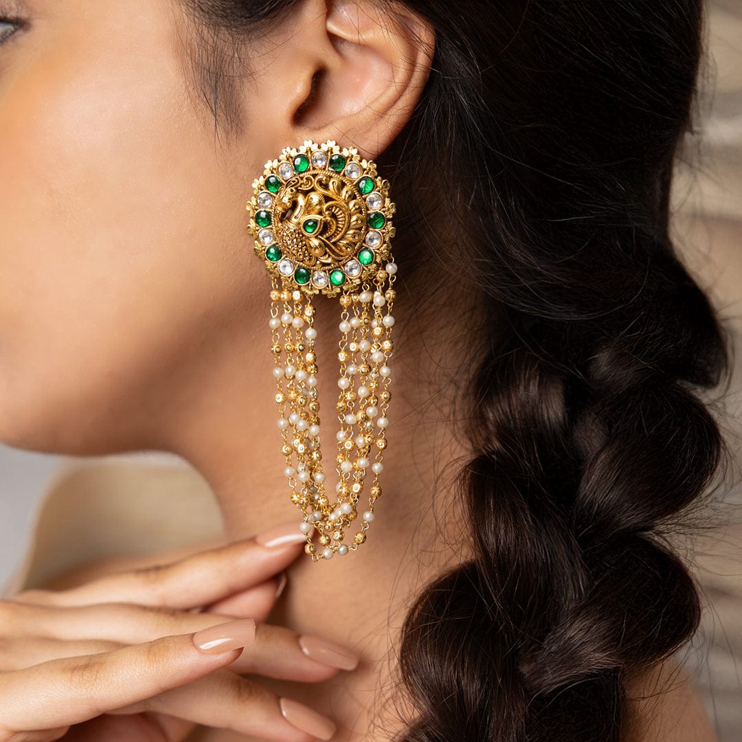 Simple gold drops with a sleek design or a bold plated design, long gold drop earrings can complement shirts and kurtas alike. It’s important to keep the colour tones in mind while shopping to perfectly pair a piece with your outfit.