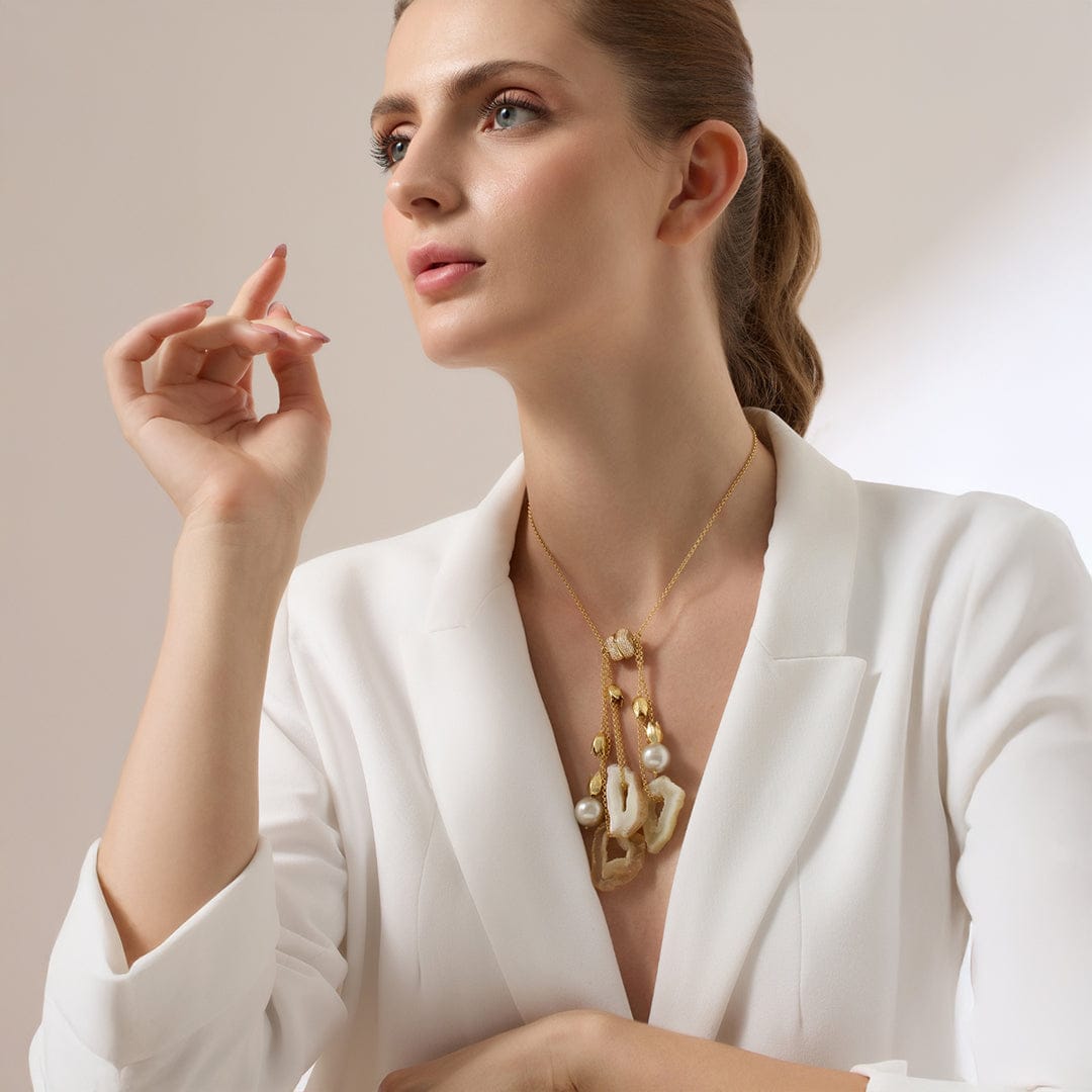 Description: The Caelitha Necklace is inspired by golden hour light and air-born crystals. It features radiant yellow quartz stones strung along a gold-toned chain, glowing with warmth and clarity. Secured with a magnetic clasp, this necklace adds a luminous accent to any look. Each quartz stone holds subtle shifts in tone and transparency, giving every necklace its own inner brilliance.