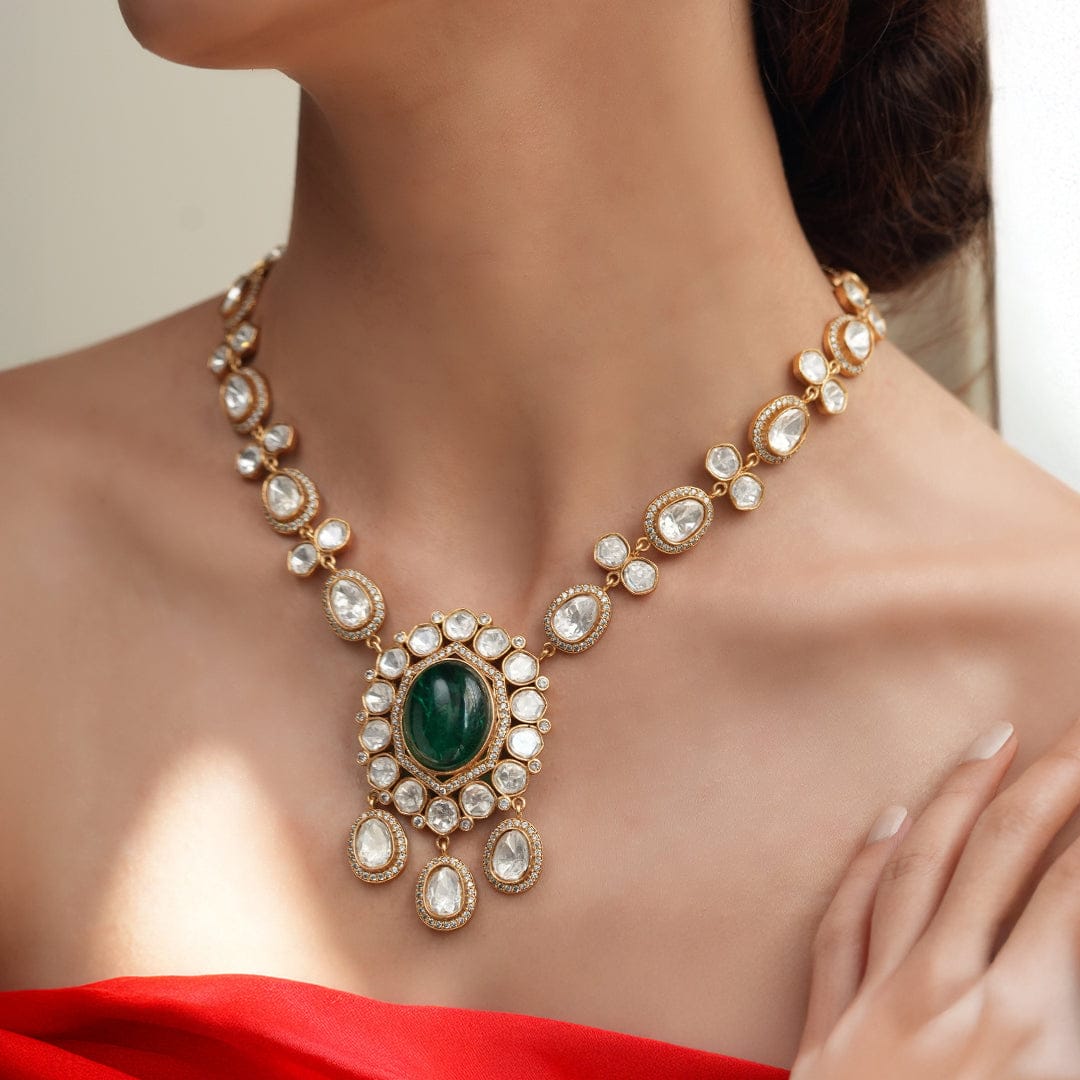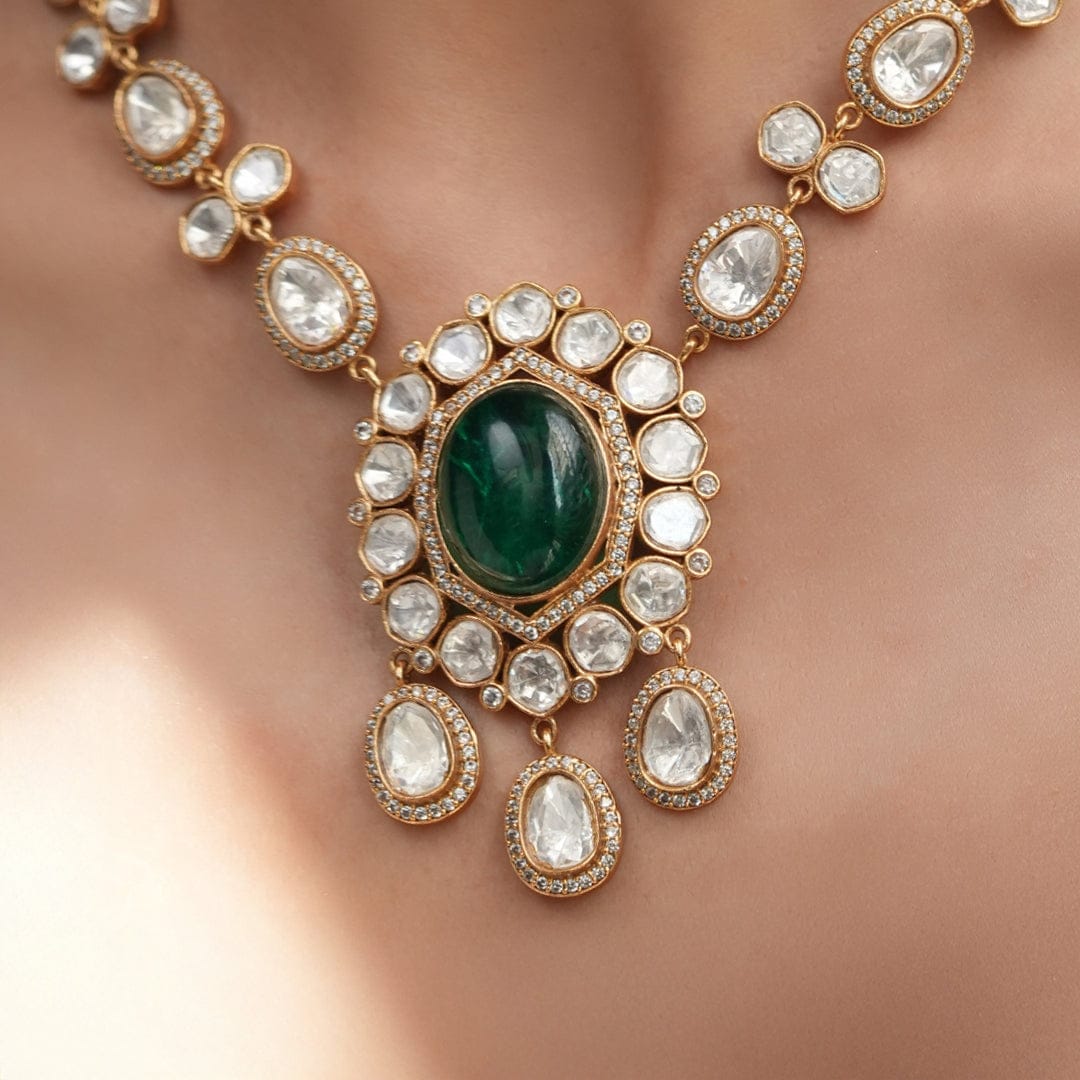 Description: A minimalist Polki necklace set with a striking green center stone and matching earrings. Simple yet luxurious, this piece brings a fresh, sophisticated vibe to any occasion