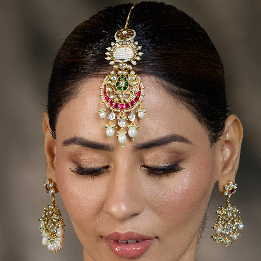 The kundan maang tikka is a legacy of royalty. Featuring polished gemstones set in rich gold frames, it adds a majestic flair to any look. Kundan tikkas are perfect for North Indian weddings, pre-wedding shoots, and destination events. It should be paired with matching kundan chandbalis for a statement bridal look.