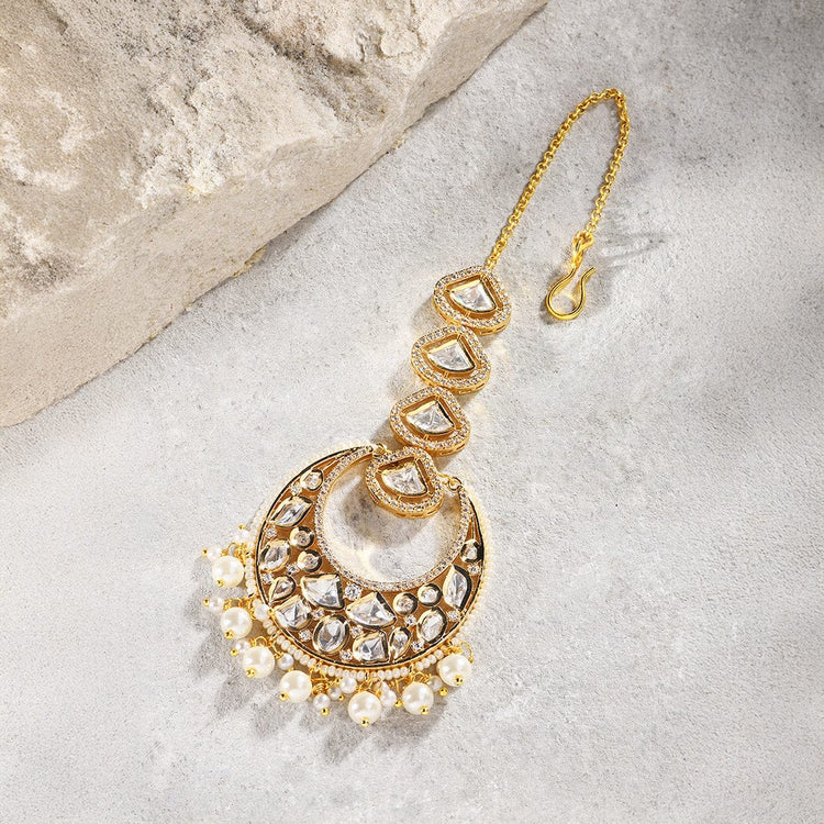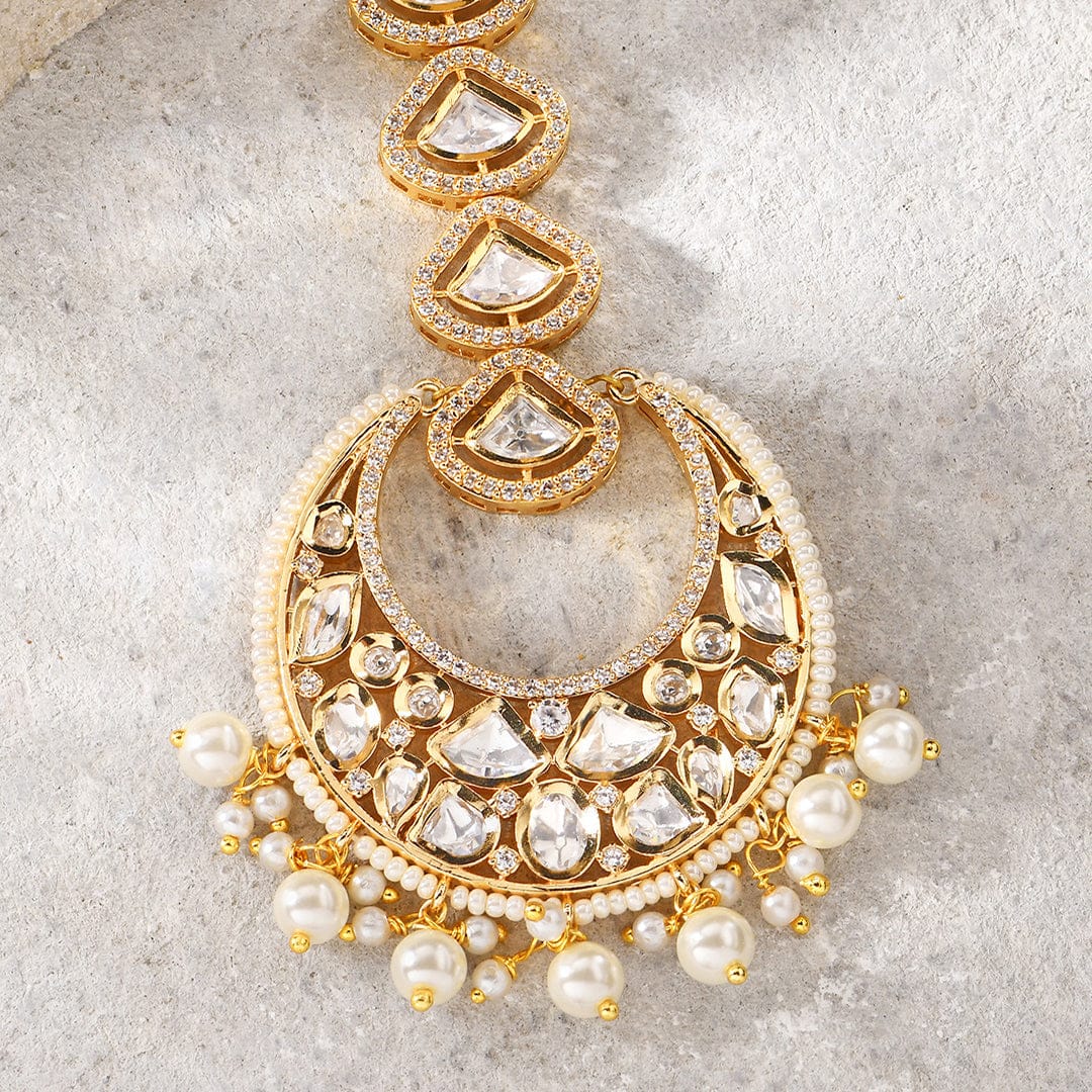 Regular price Rs. 4,050.00Description: iluminate your beauty with the Maangtikka With Pearls. 22KT Gold Plated, featuring hydro polki and lustrous pearls, this headpiece is intricately crafted for weddings and festivities. Elevate your grace and make it a timeless addition to your treasure.