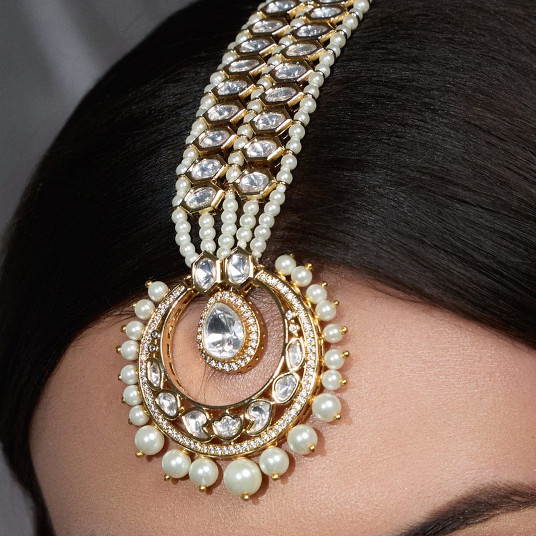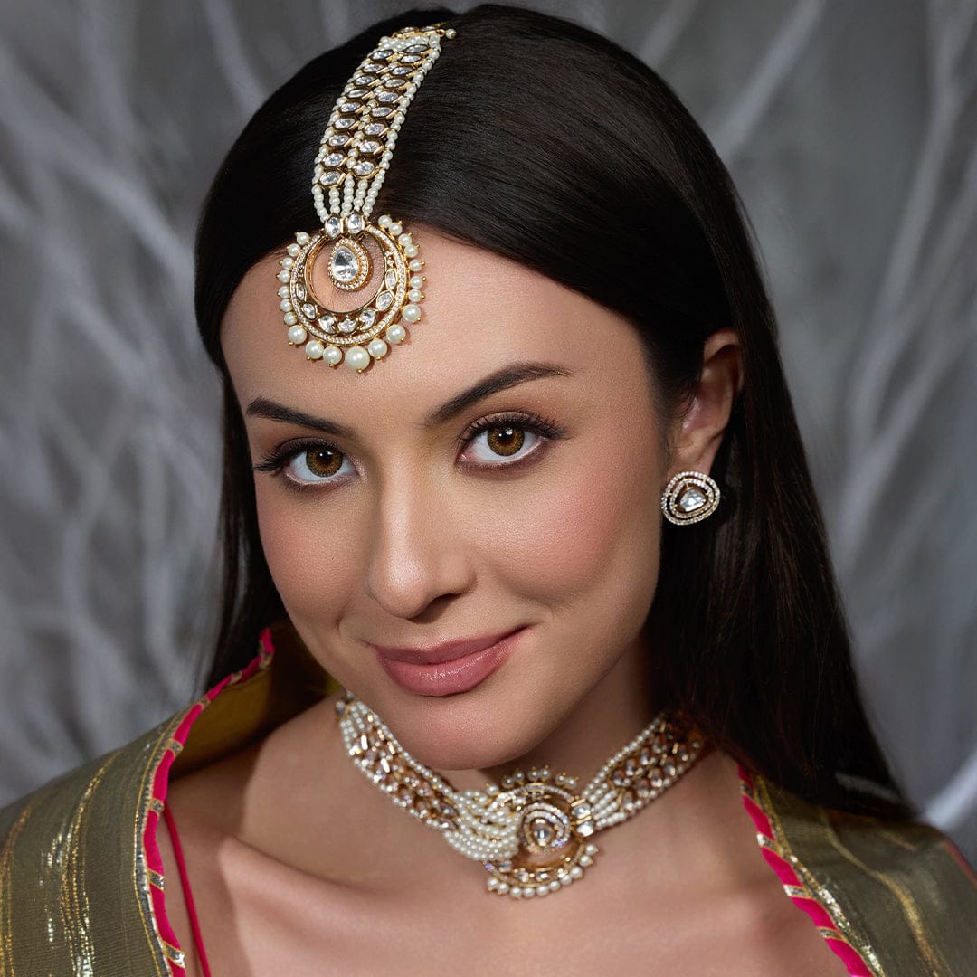 Description: Radiate sophistication with this Shaahi Shringar Maang Tikka, designed to complement your traditional ensemble beautifully. Featuring delicate gold-toned detailing and sparkling stones, it forms a stunning circular centrepiece that adds a regal charm to your look. Lightweight and comfortable, this maang tikka is perfect for weddings, festive occasions, or cultural celebrations, effortlessly enhancing your grace and style.