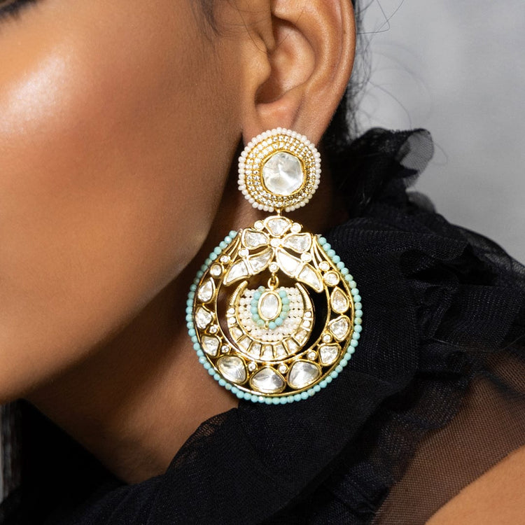 Shine on your special day with our Polki and Pearl Drop Earrings. 22Kt Gold Plated, adorned with hydro polkis, pearls, and turquoise beads, these earrings exude elegance. Perfect for weddings, parties, festivals, or personal milestones.