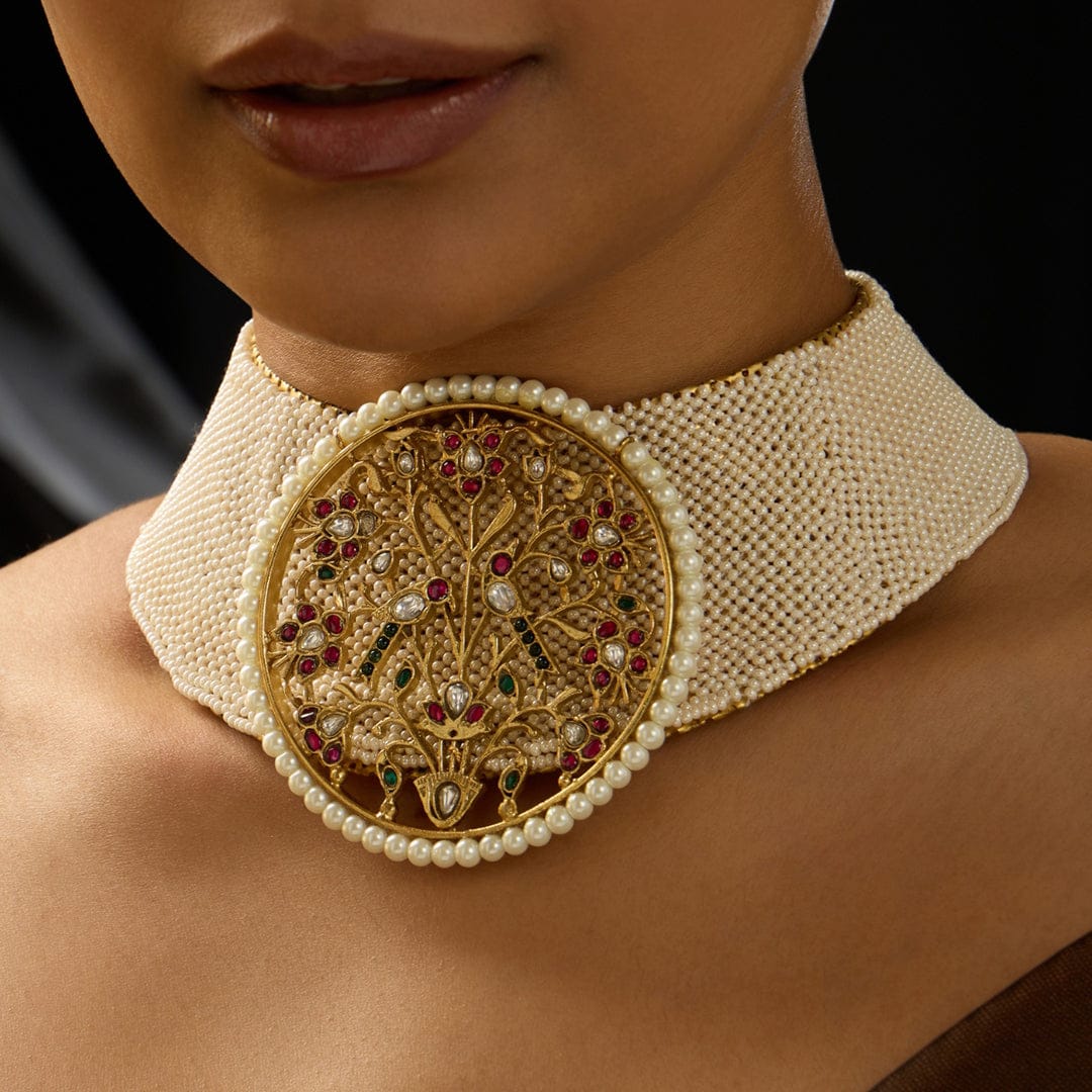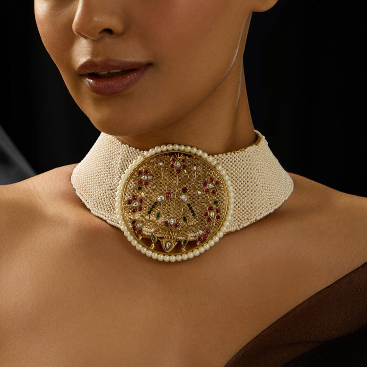 Description: Embrace the elegance of tradition with the Pearl Temple Fusion Stiff Collar Necklace. This exquisite piece showcases a blend of contemporary design and classic elements, featuring a structured collar silhouette adorned with lustrous pearls. Intricate temple motifs intersperse throughout, adding a touch of heritage to this modern statement necklace. Perfect for elevating both ethnic and western outfits, this collar is a stunning accessory for special occasions or a chic evening out.