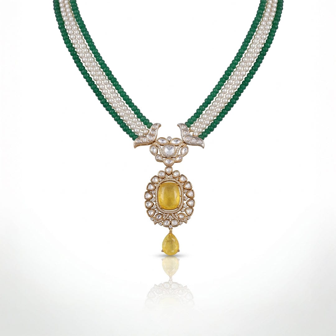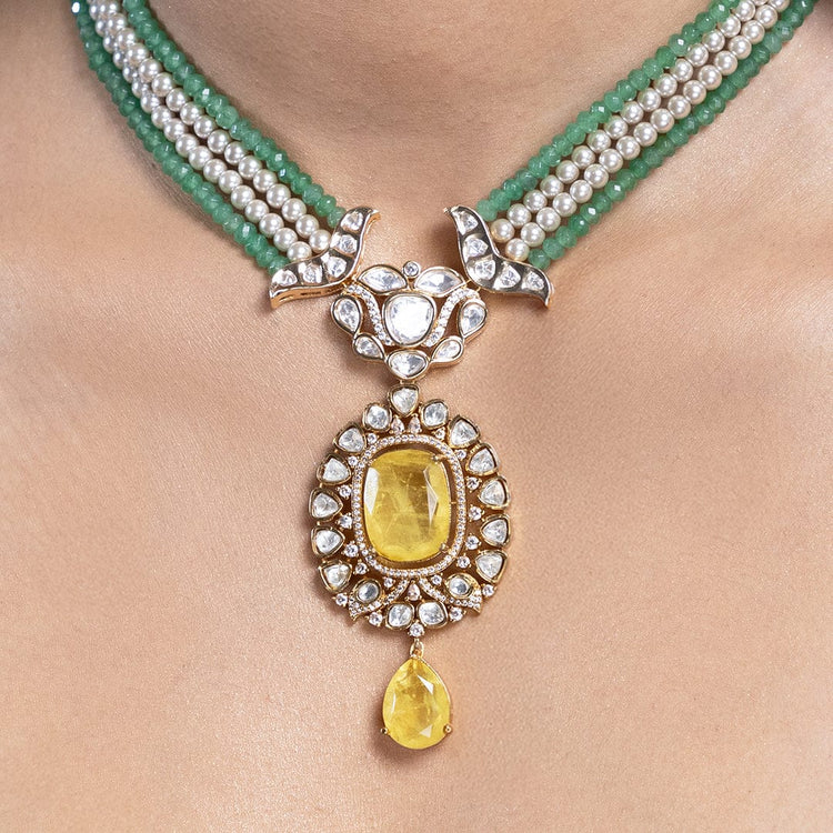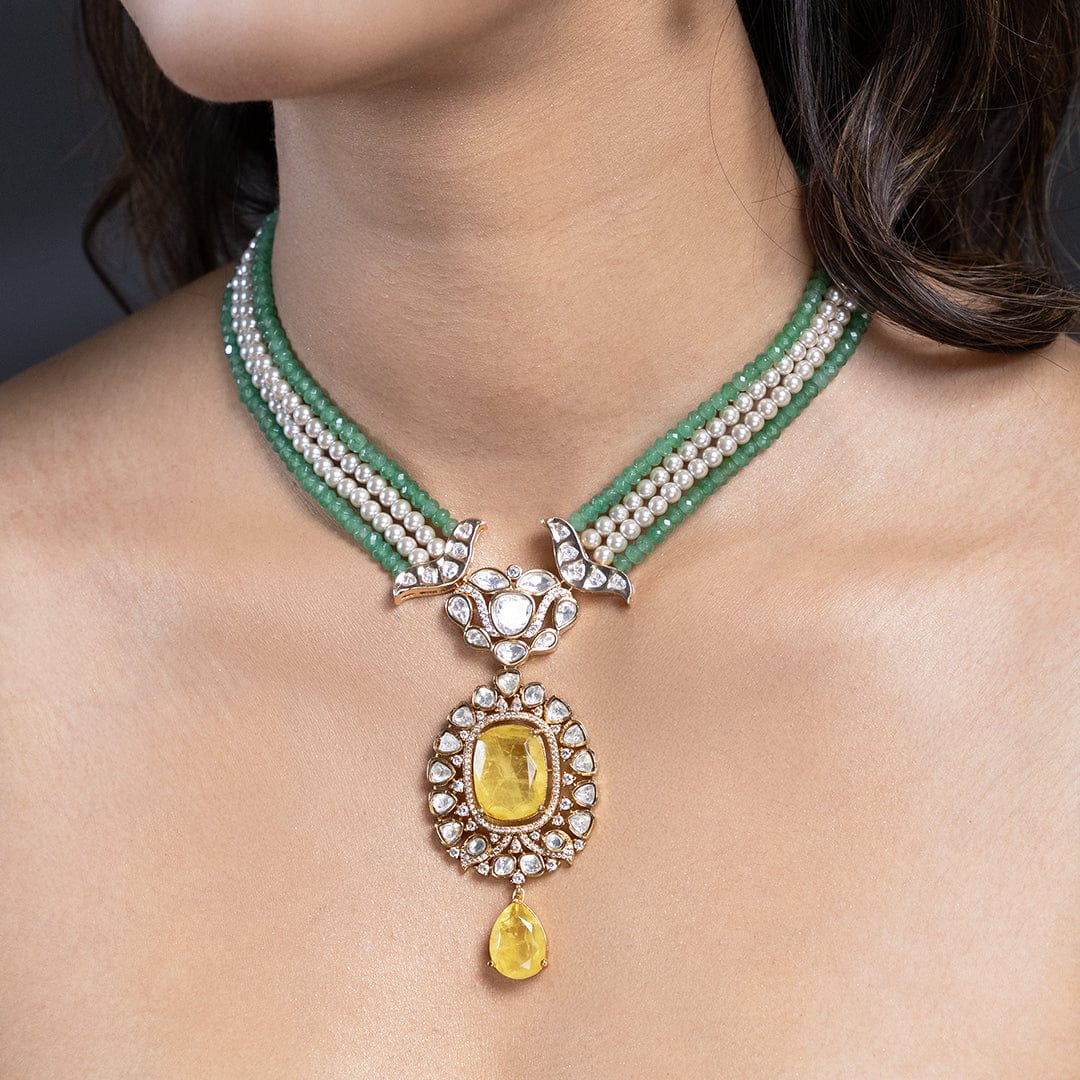 Description:An artful couture necklace set captures graceful proportions and refined polish. styled with sarees, lehengas, and contemporary drapes.