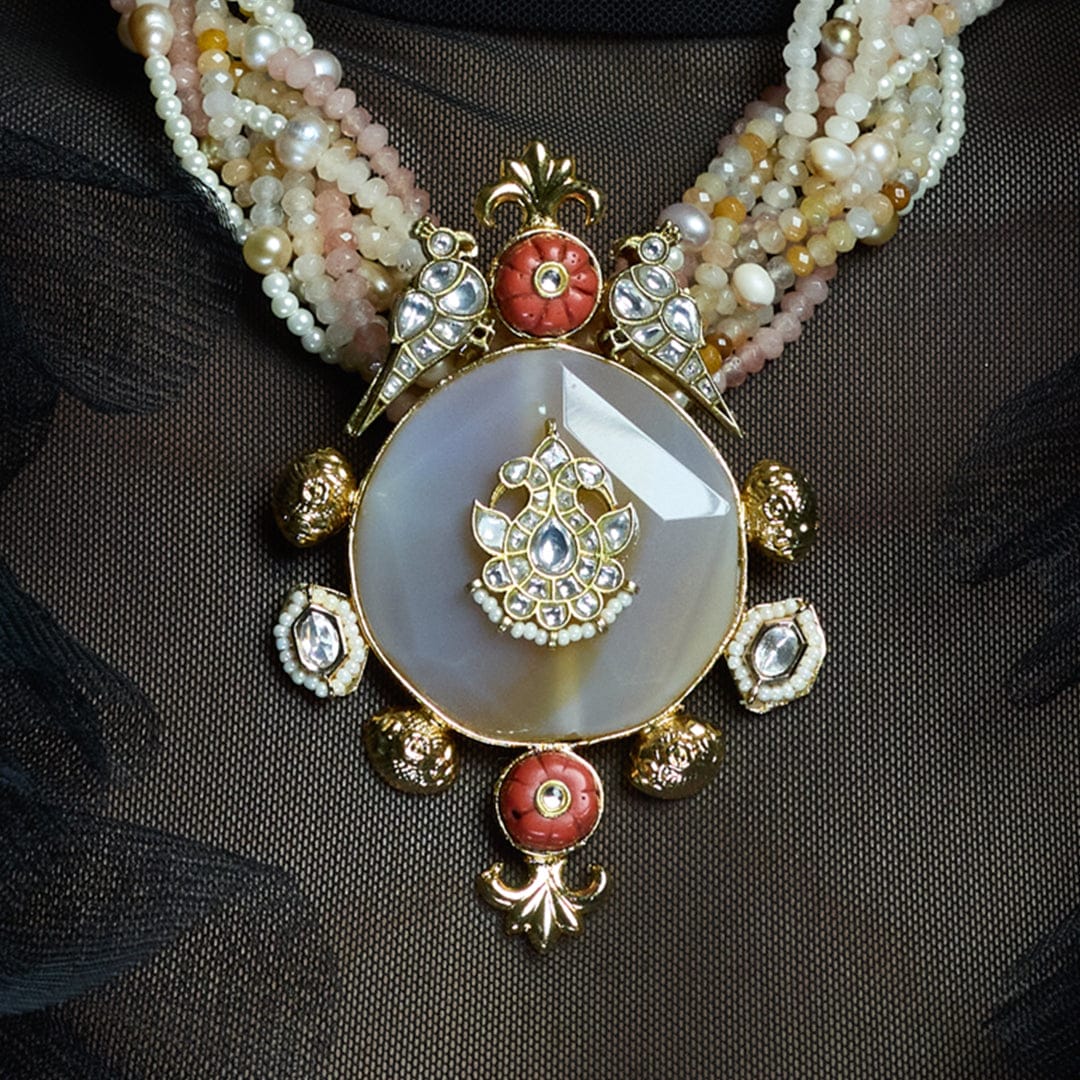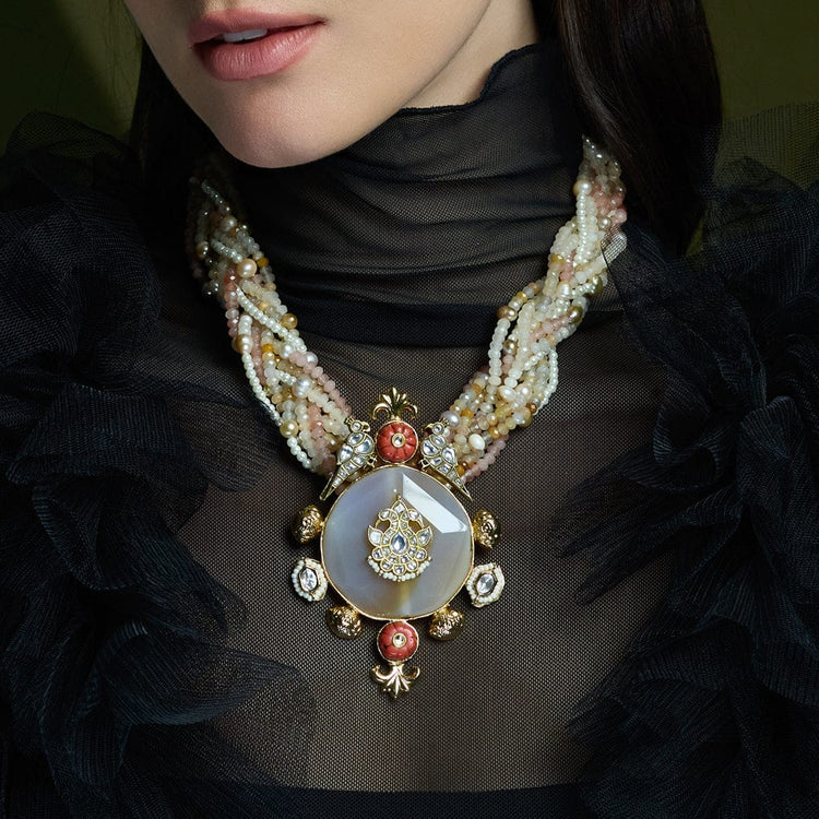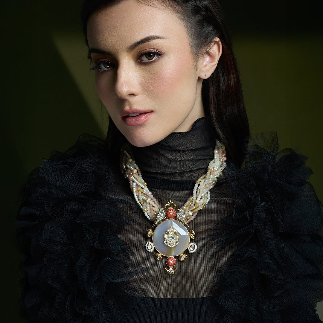 Description: A dreamy fusion of rose pink beads and green stone detailing, this choker brings timeless grace and a hint of tradition to your festive look..
