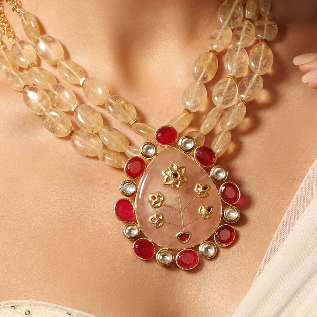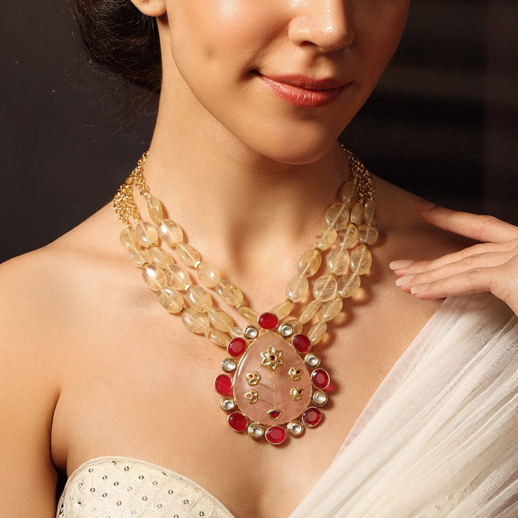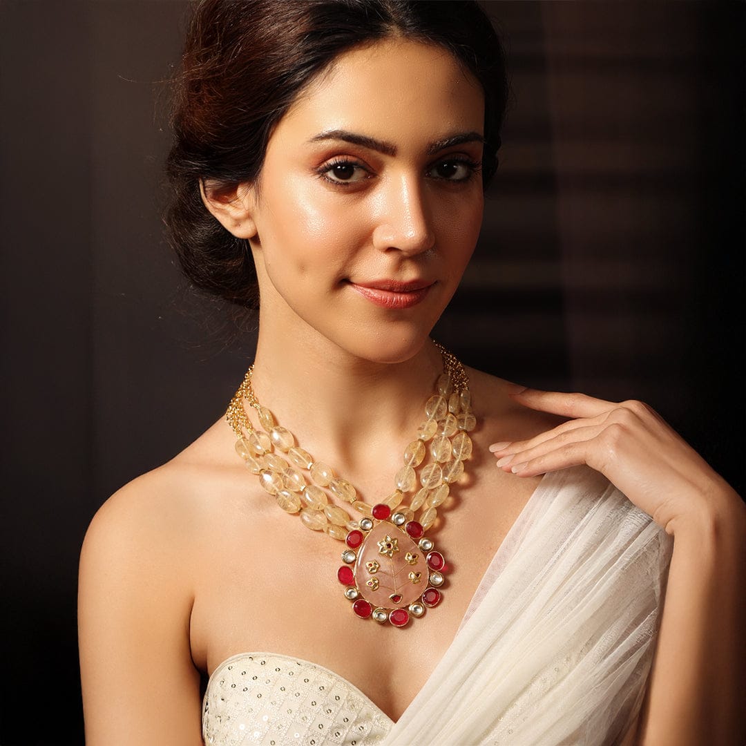 We use 22K Micron Gold Plating on brass, paired with high quality pearls, precious carved beads, semi precious stones, intricately hand painted with enamel, exquisite high quality pearls and high quality kundan that are celebrated for their durability and refinement - making every Joules by Radhika creation a piece that radiates brilliance and sophistication.
