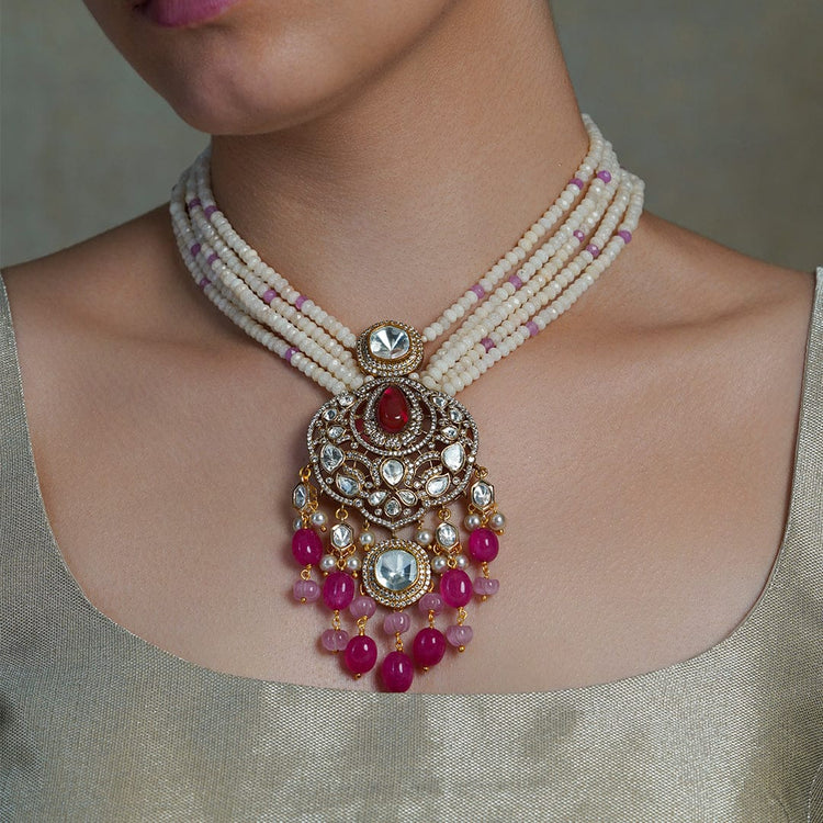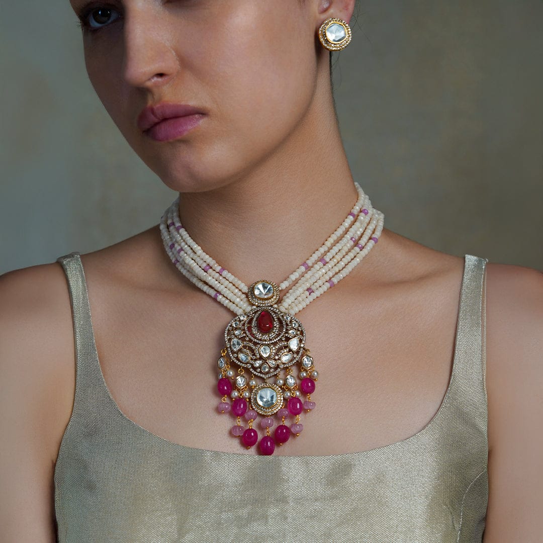 Description: Experience traditional grandeur with the Rubypearla Cascade Rani Haar Set, showcasing cascading ruby-hued beads and radiant pearls in a majestic design.