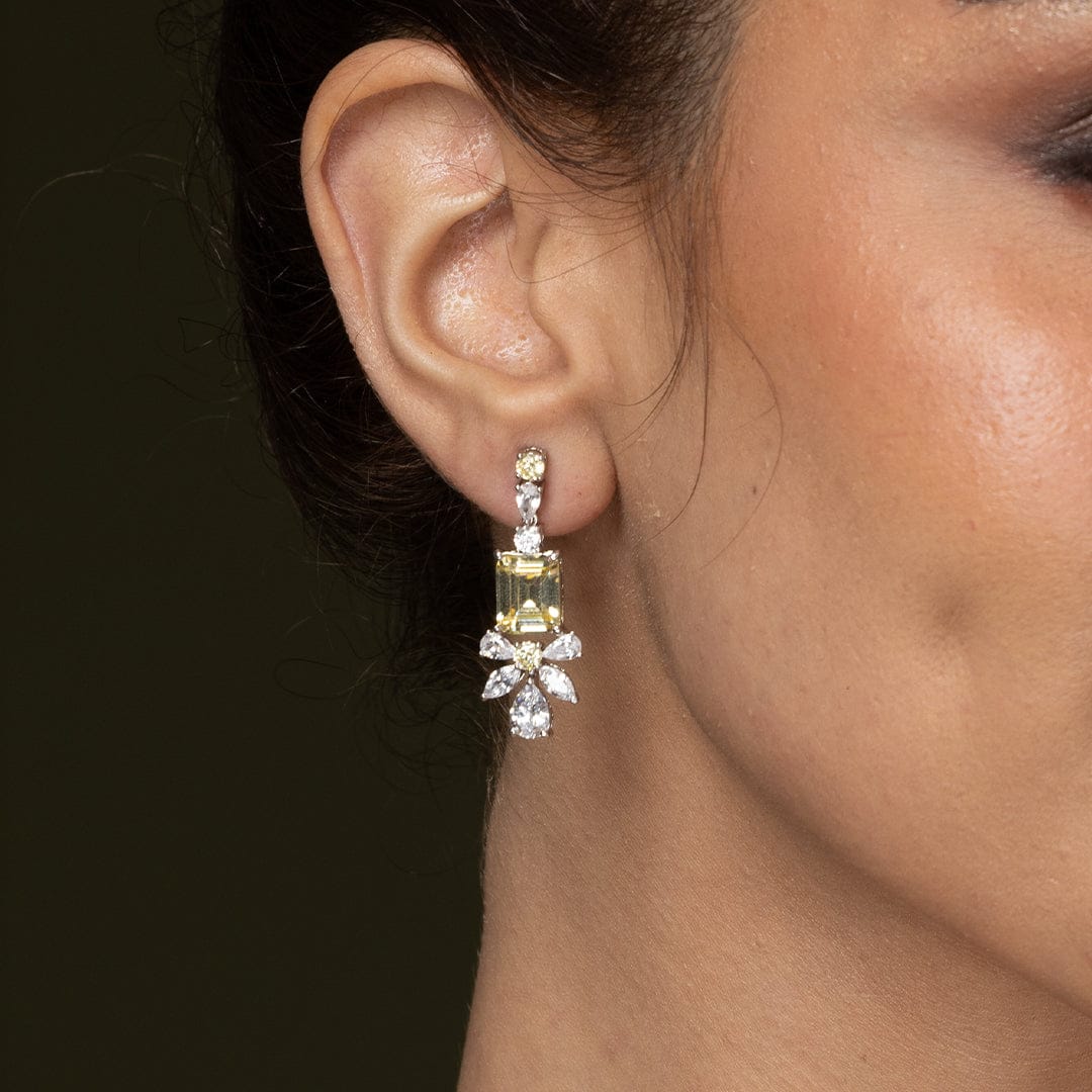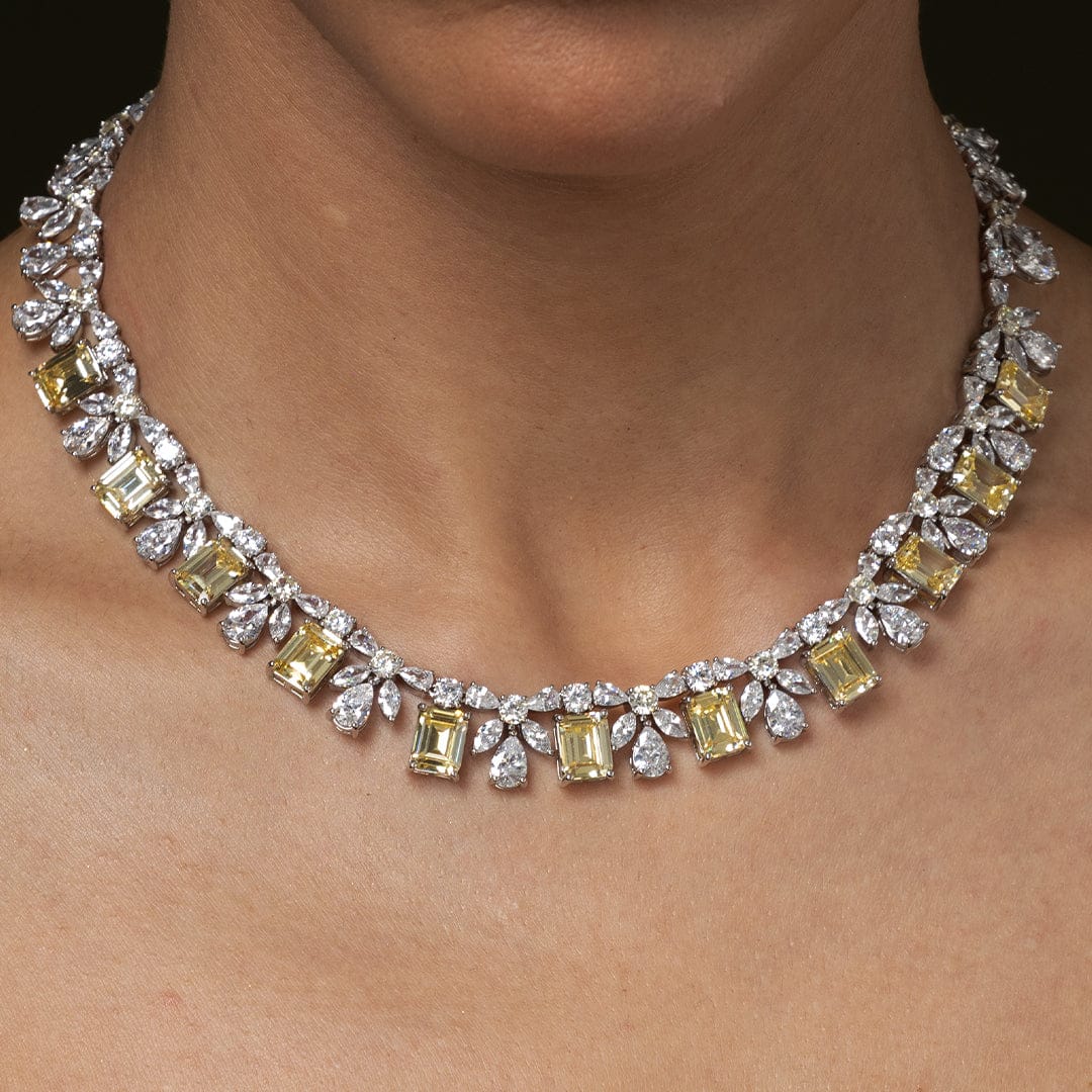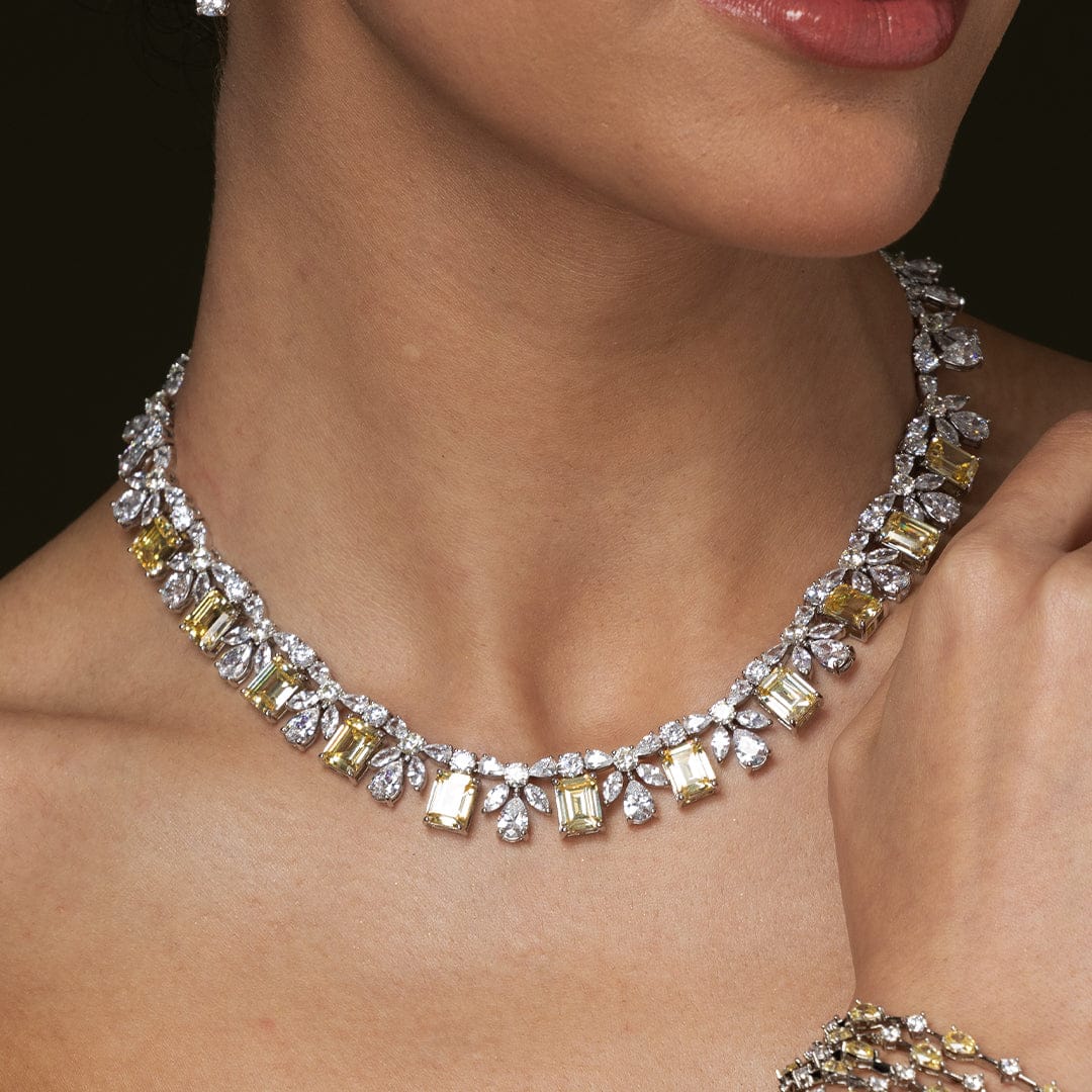 Description: This necklace set is a radiant and cheerful expression of elegance. This continuous-line necklace features a beautiful, repeating pattern where bright, rectangular canary yellow gemstones are individually framed by clusters of shimmering, clear, marquise-cut accents.