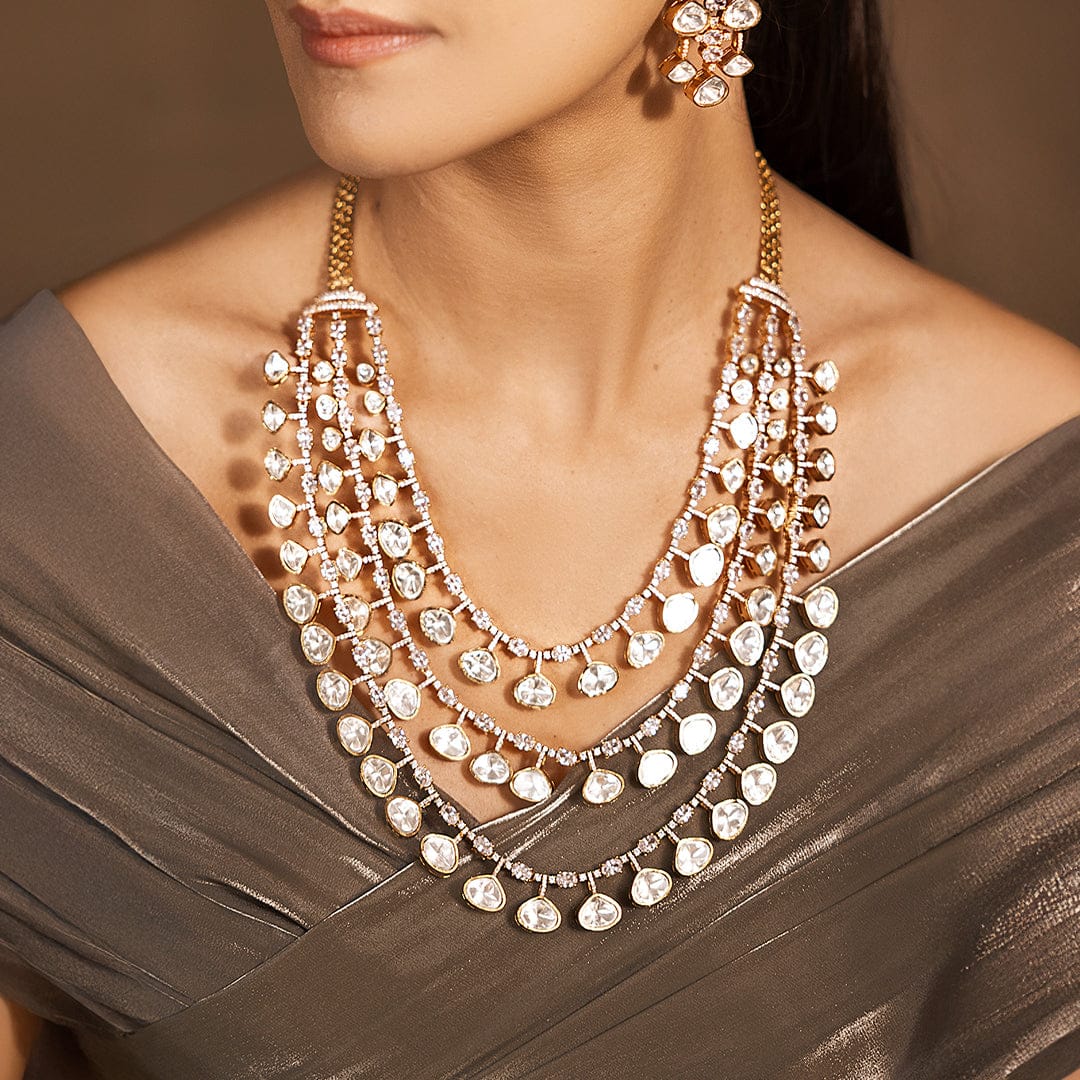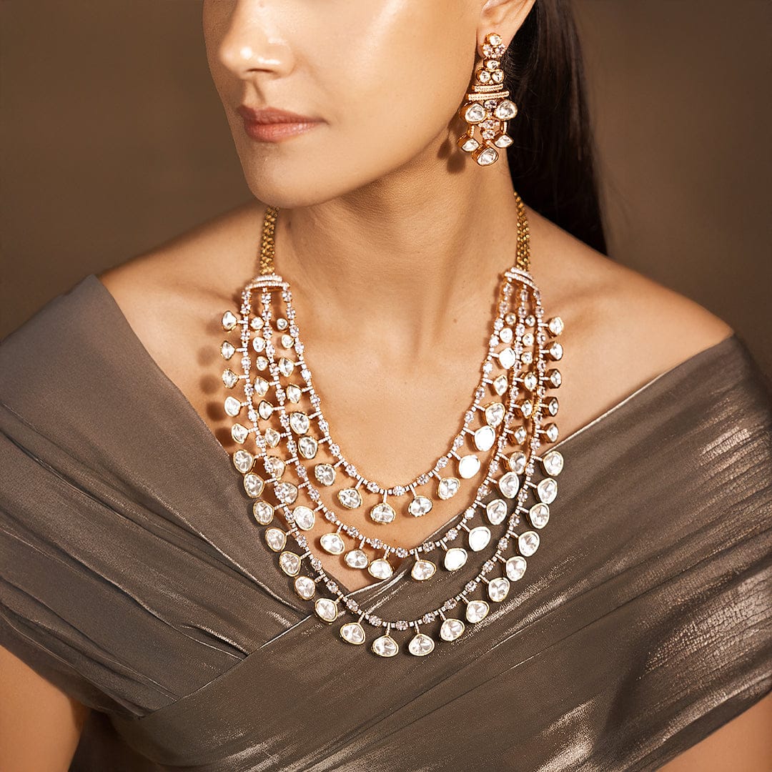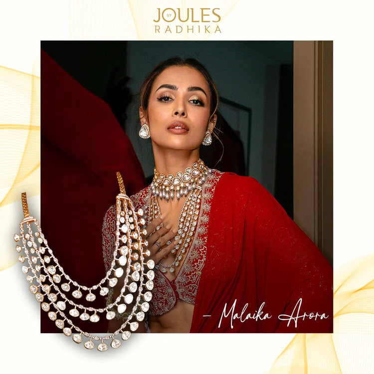 We use 22K Micron Gold Plating on brass, paired with high quality pearls, precious carved beads, semi precious stones, intricately hand painted with enamel, exquisite high quality pearls and high quality kundan that are celebrated for their durability and refinement - making every Joules by Radhika creation a piece that radiates brilliance and sophistication.