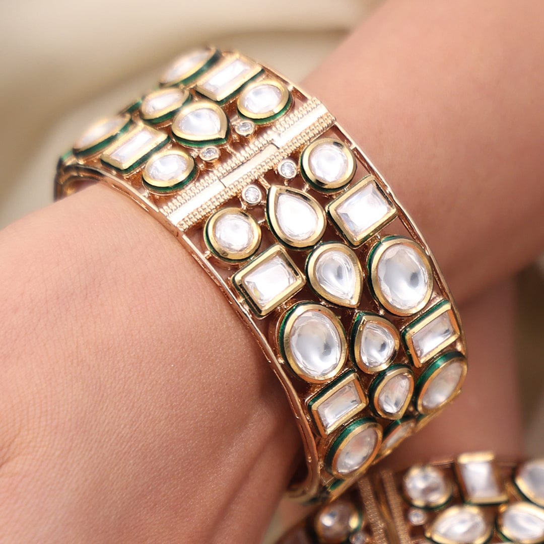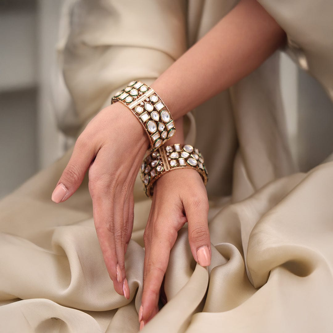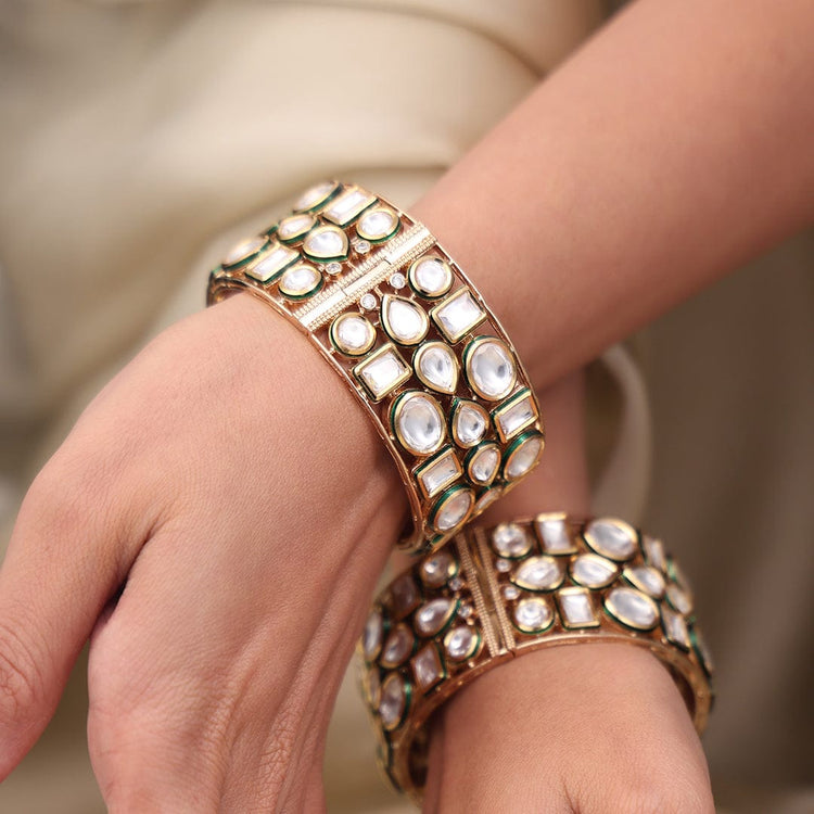Description : Featuring royal charm, the Grand Heirloom Bangle Set is intricately crafted with sparkling stones and golden brilliance. A true statement piece, it embodies tradition, luxury, and elegance for every grand occasion.