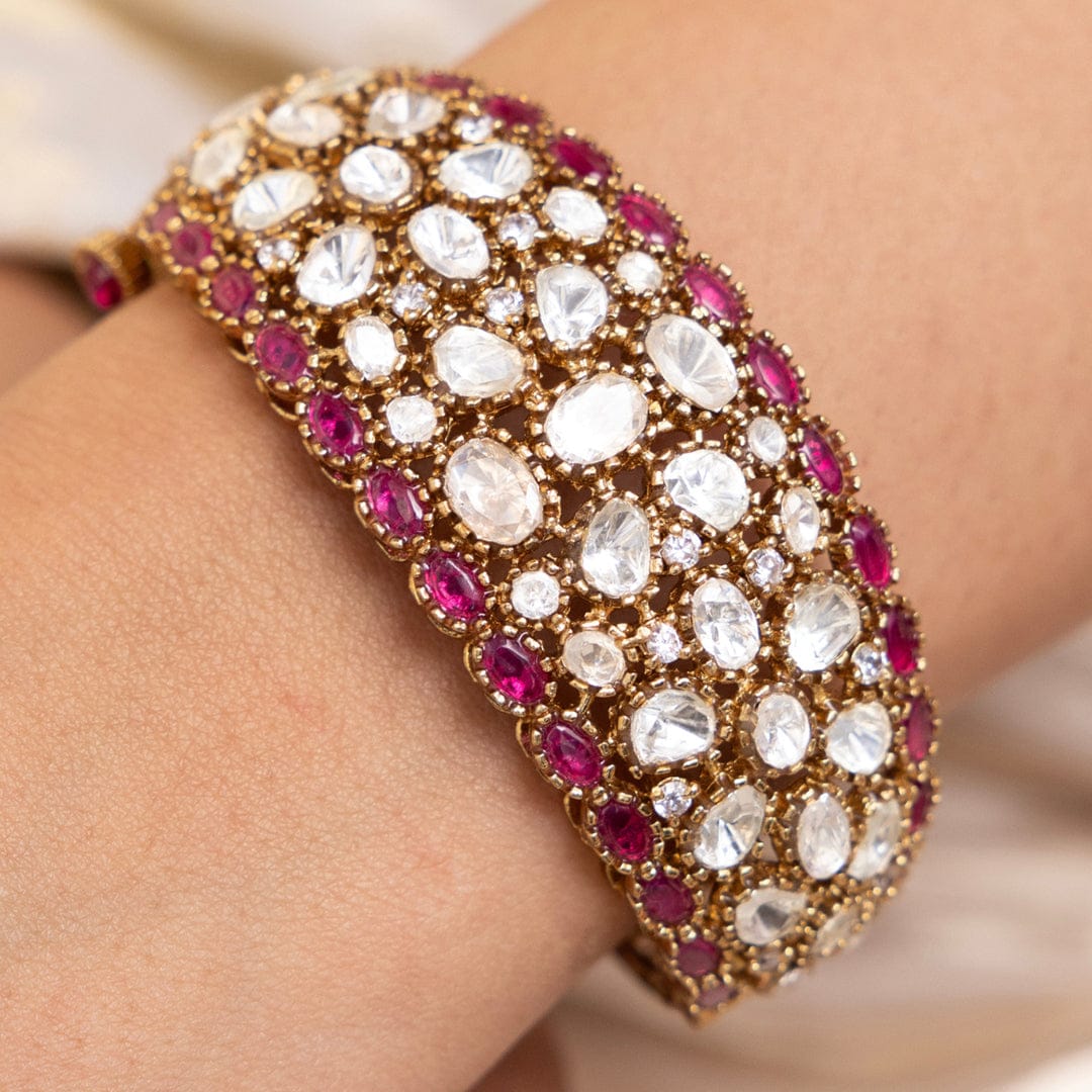 Description : This broad kada bangle in a soft pink enamel finish is studded with rows of kundan stones for a rich, heritage look. Perfect for bridal trousseaus or ethnic wear with pastel tones.