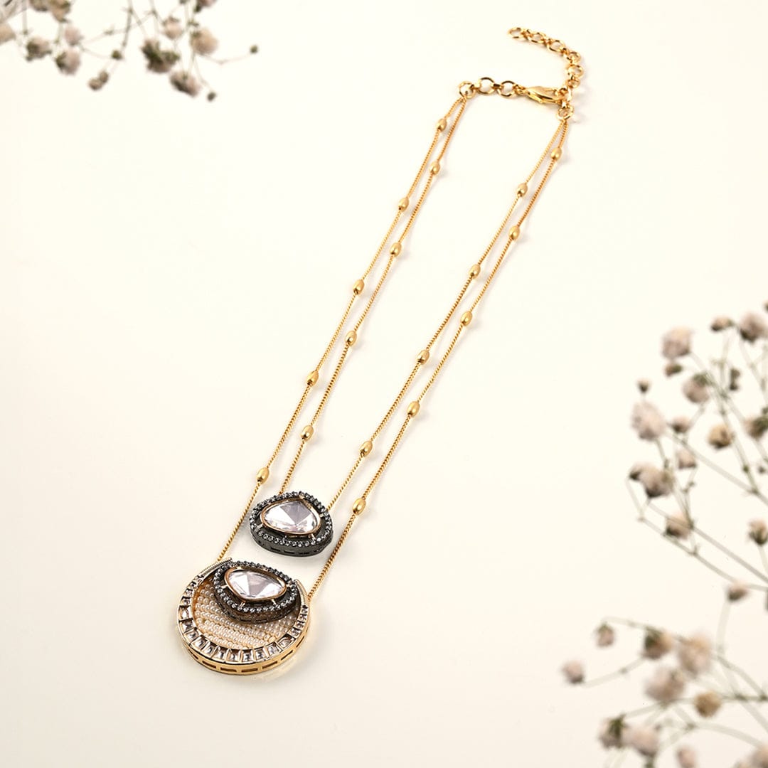 Description: Layered Dainty Necklace With Polki" is a designer's vision, featuring double layers with kundan polki of different sizes, polished elements, and pearl beads. Ideal for any occasion, it suits both Western and Indian attire, radiating regal elegance with real semi-precious stones.