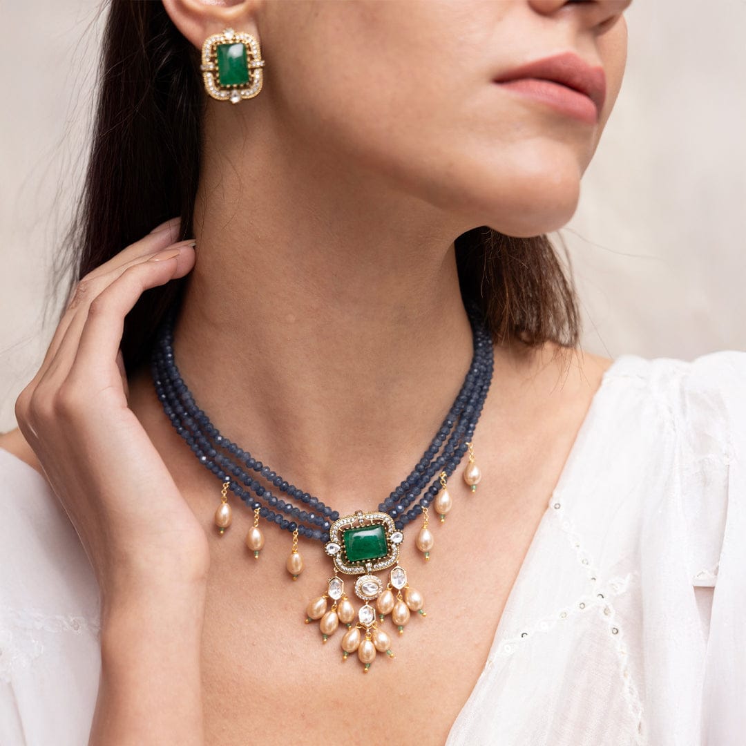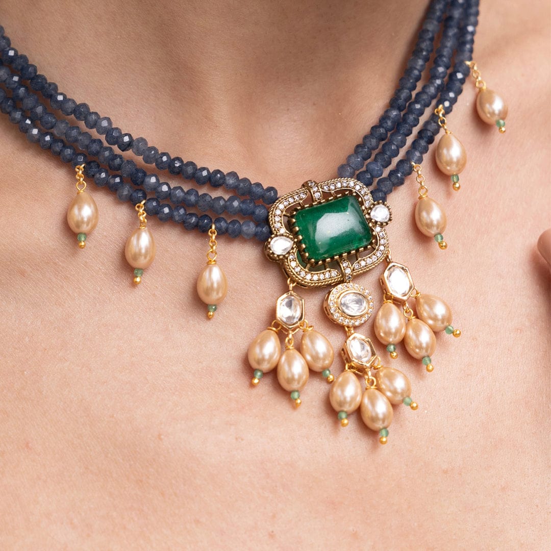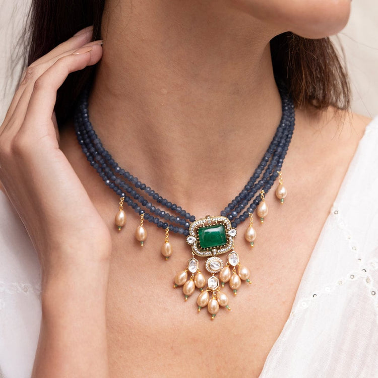 Description: A deep blue beaded choker adorned with a central kundan pendant and tiny pearl danglers. This piece offers a rich, royal tone perfect for evening wear or contemporary festive looks.