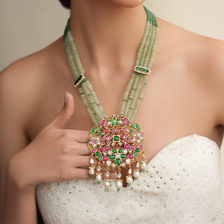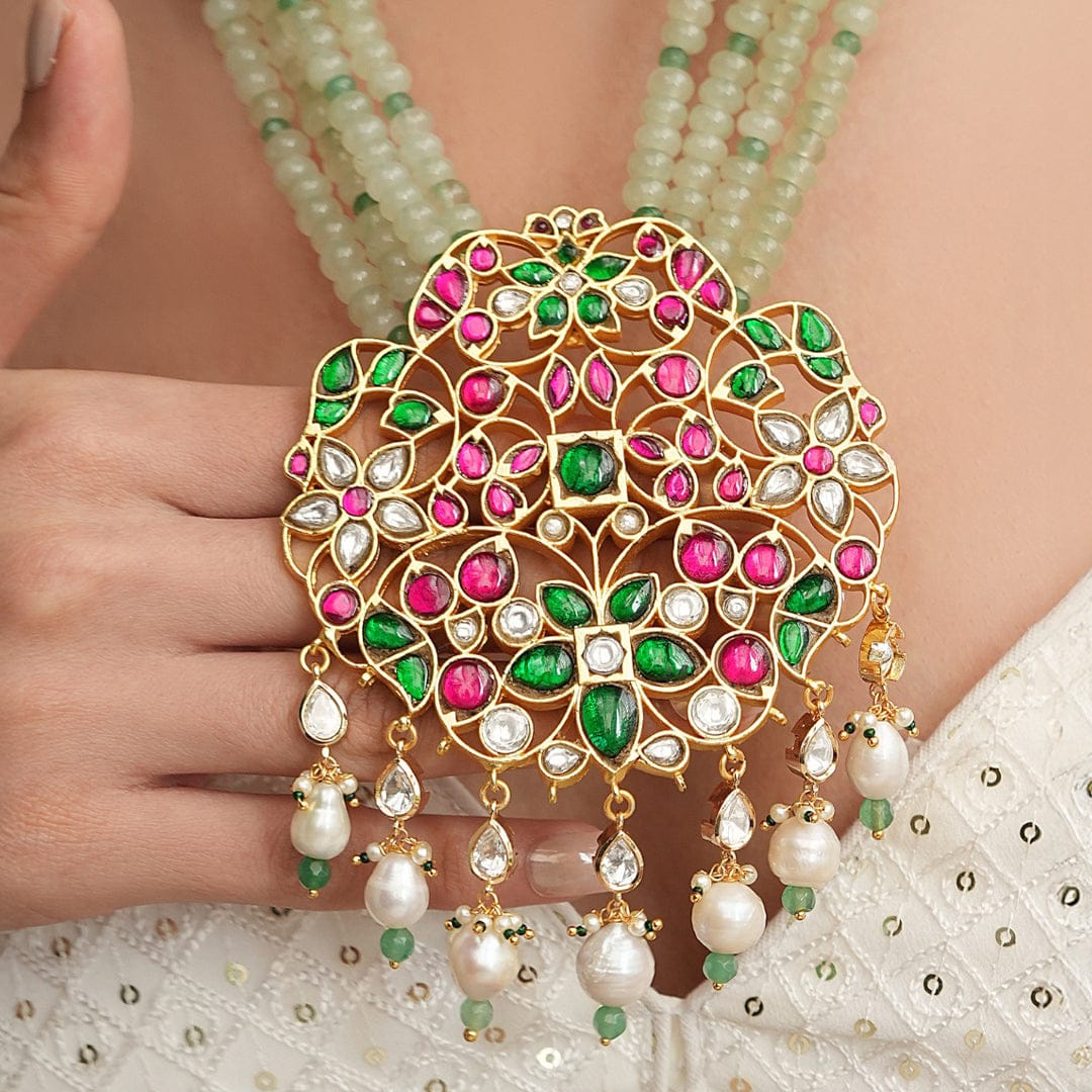 Description: A long beaded chain necklace featuring a stunning Mewar-inspired centerpiece. The design reflects rich Rajasthani craftsmanship, adding a regal touch to any traditional ensemble.