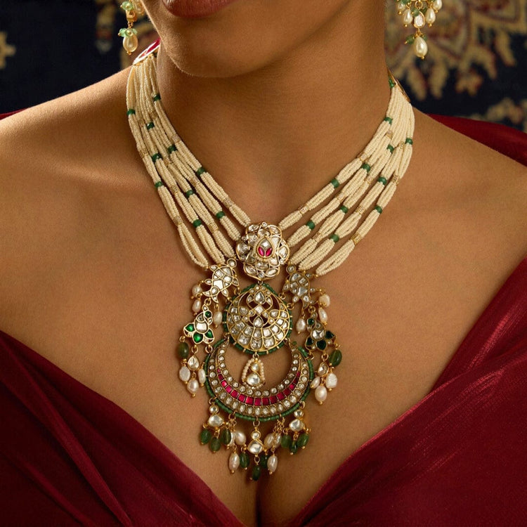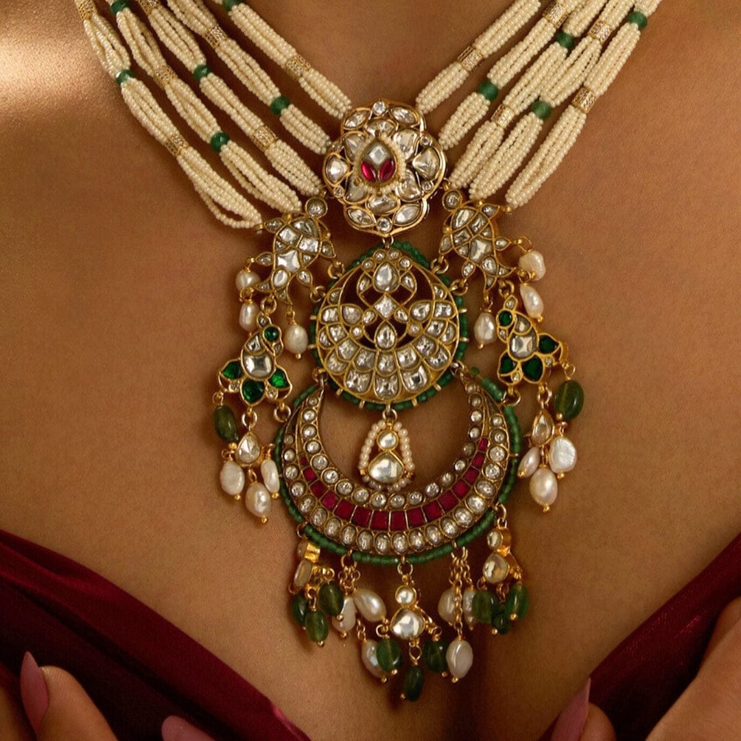 We use 22K Micron Gold Plating on brass, paired with high quality pearls, precious carved beads, semi precious stones, intricately hand painted with enamel, exquisite high quality pearls and high quality kundan that are celebrated for their durability and refinement - making every Joules by Radhika creation a piece that radiates brilliance and sophistication.