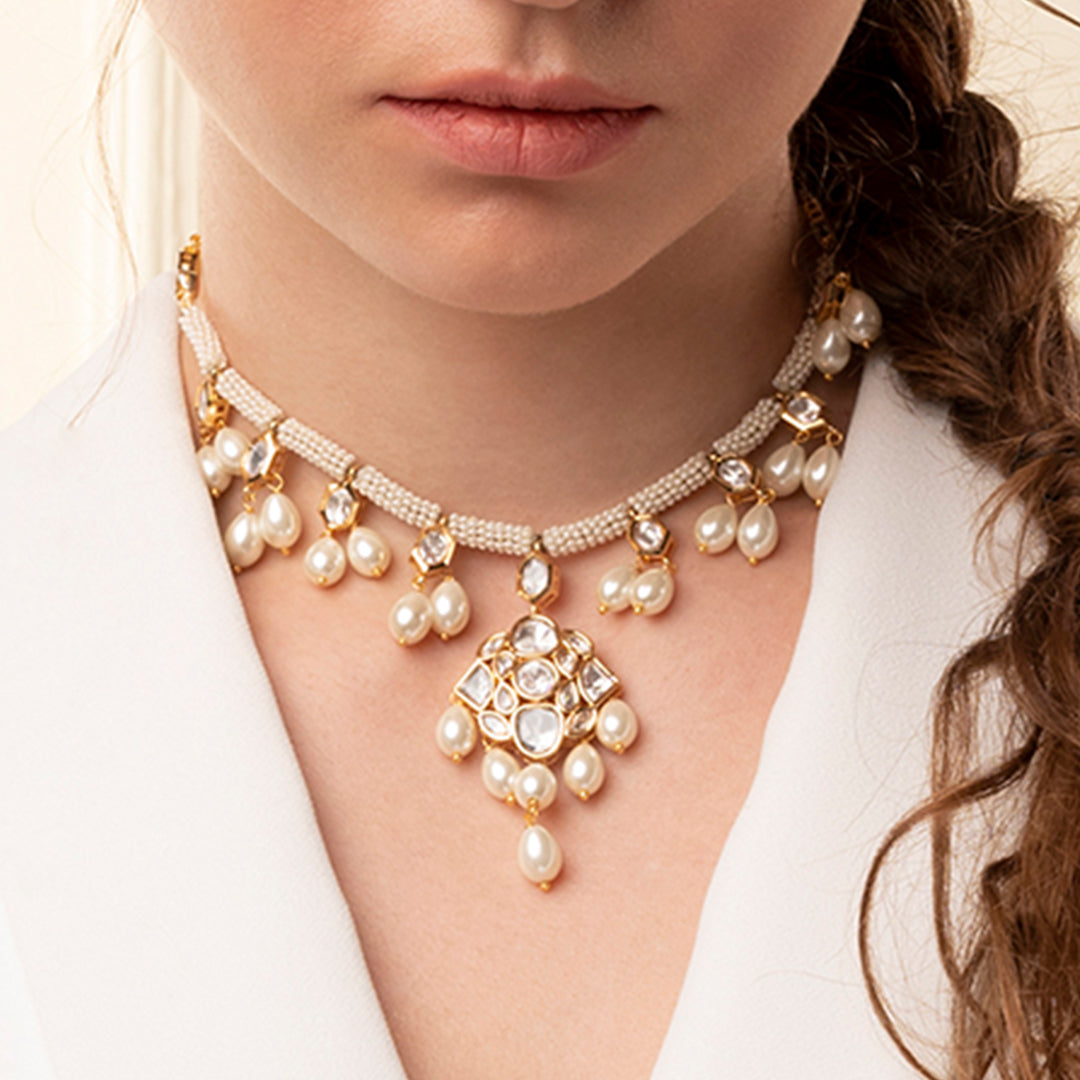 White Pearl Long Necklace With Polki - Joules by Radhika
