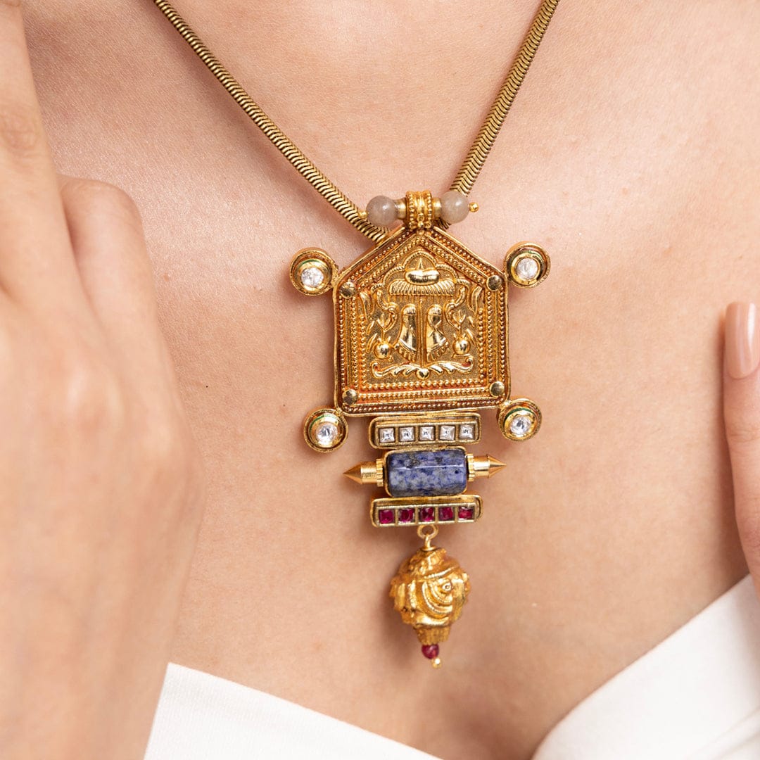 Regular price Rs. 5,520.00Description: Rooted in temple jewelry aesthetics, this pendant showcases a traditional Ganesha motif with layered bead drops and intricate detailing. A sacred yet stylish pick for festive rituals and spiritual celebrations.