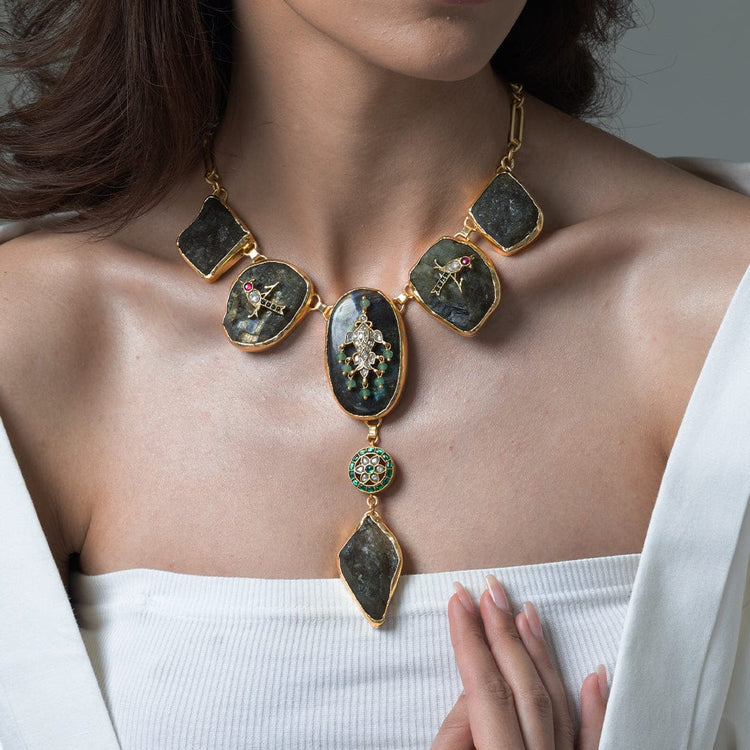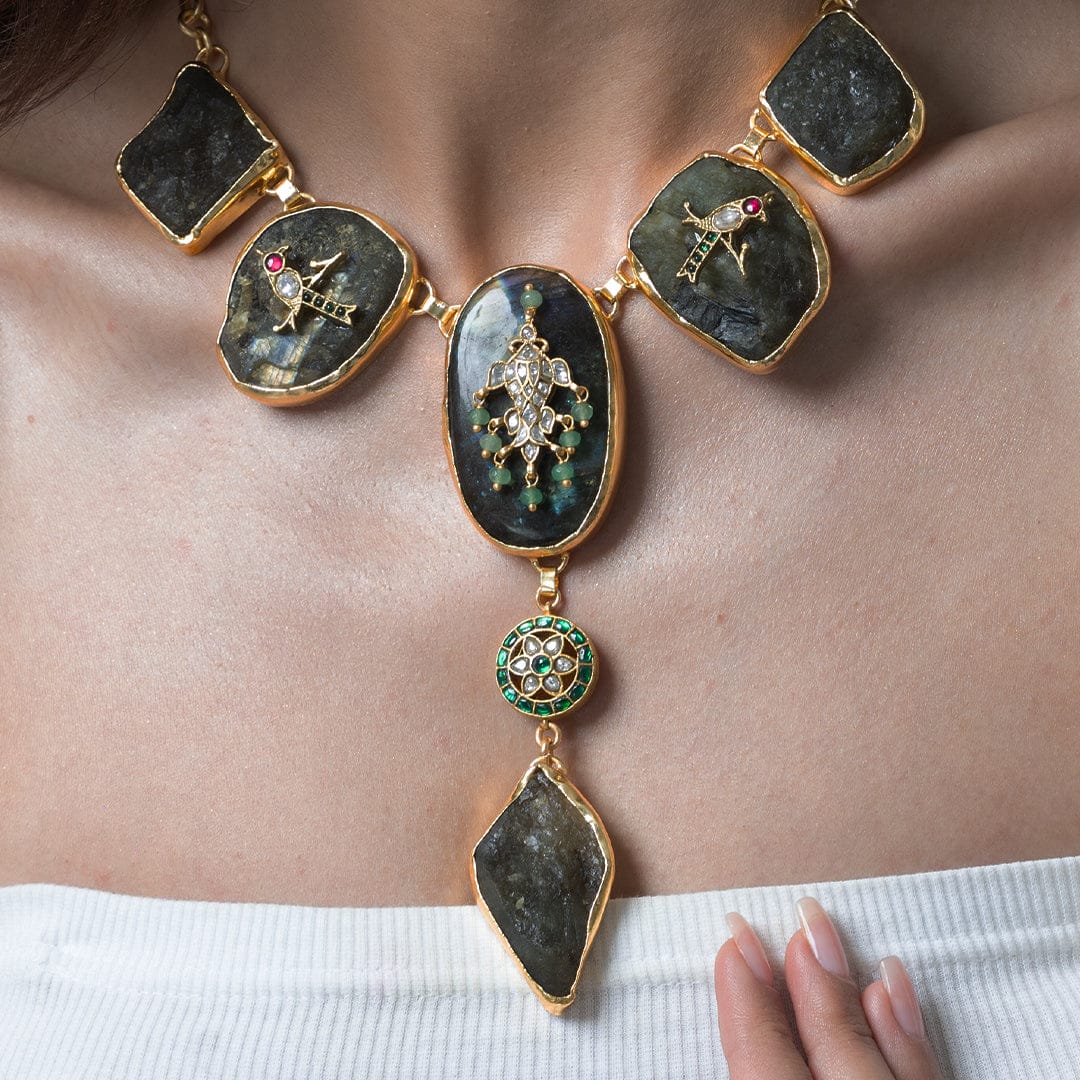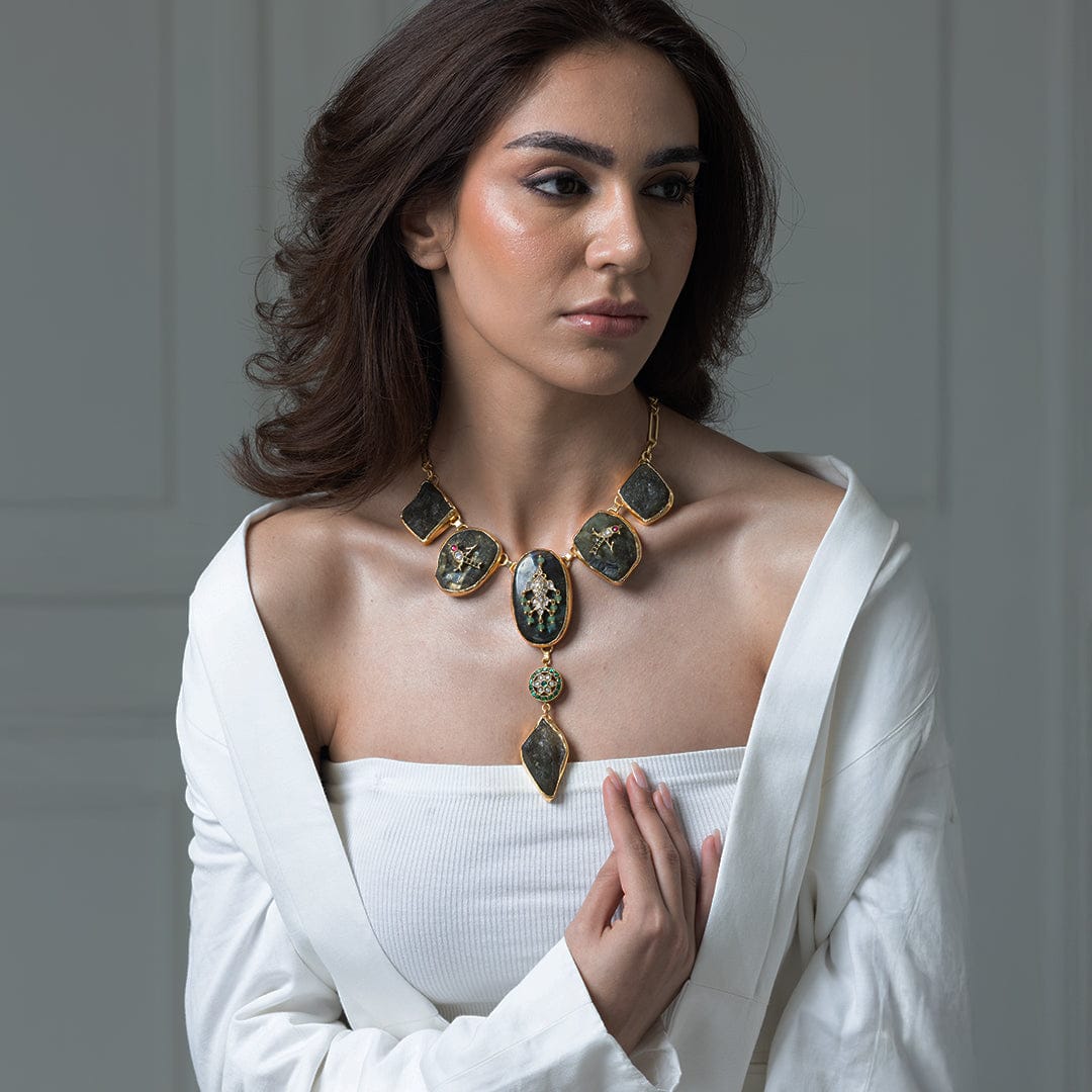 Regular price Rs. 7,200.00Description: A stylish, eye-catching necklace having unique stones with a touch of green at the centre to grab attention. Its modern yet elegant design makes it perfect for parties, dinners, or everyday glam.