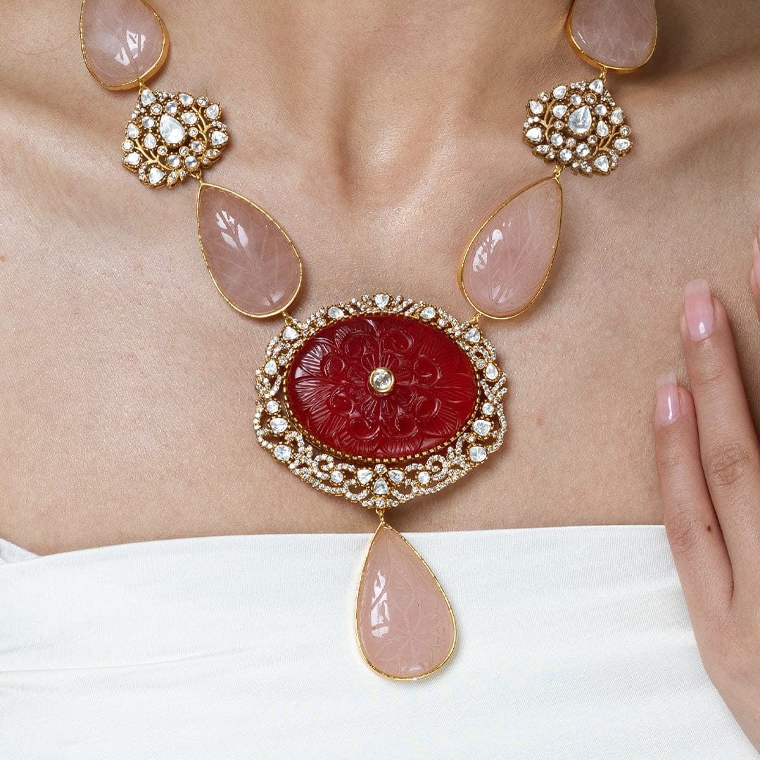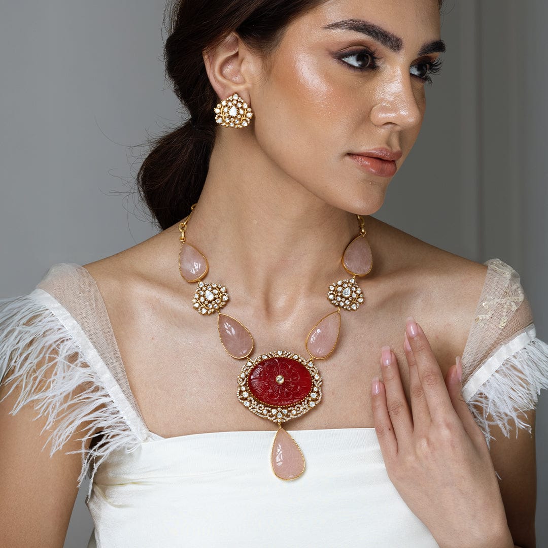 Regular price Rs. 18,000.00Description: Adorn yourself with this elegant ShopJBR long necklace set featuring large rose quartz teardrops and sparkling Kundan accents. The long pendant chain showcases a vibrant carved central stone. This set includes a chic matching finger ring.