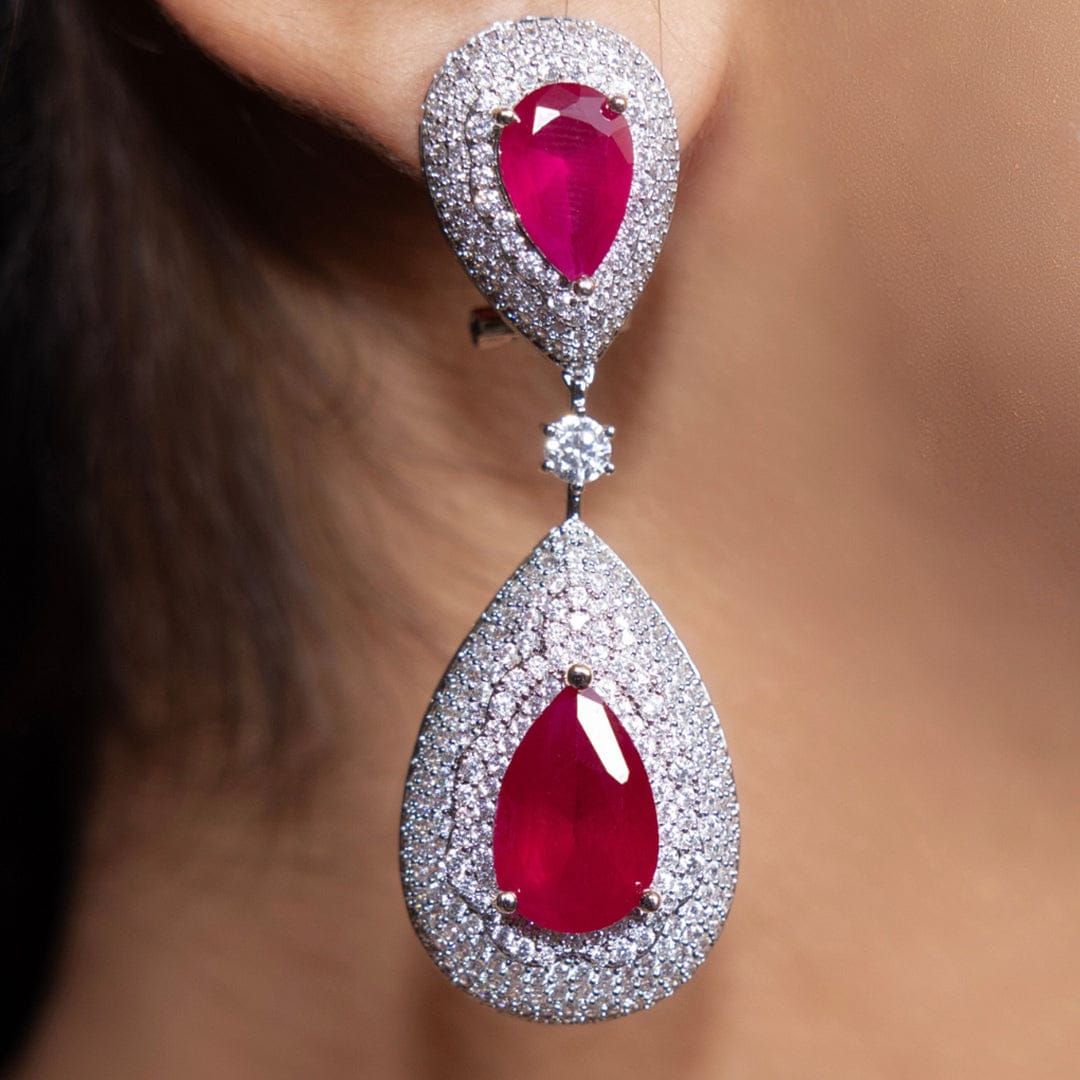 Regular price Rs. 5,520.00Description: Drop earrings featuring a duo of ruby red stones framed with glistening crystals. Elegant and eye-catching, perfect for formal evenings and bridal soirées.