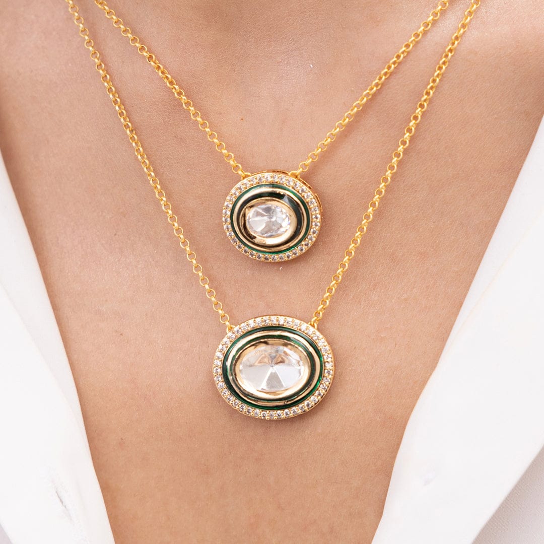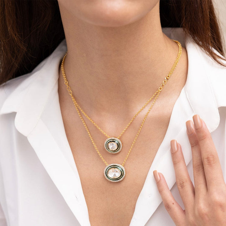 Regular price Rs. 3,000.00Description: This elegant multi-pendant necklace features gold-etched motifs suspended from a slim chain, offering a balance of refinement and character. Best worn with classic or fusion attire, it adds a graceful rhythm to any neckline.
