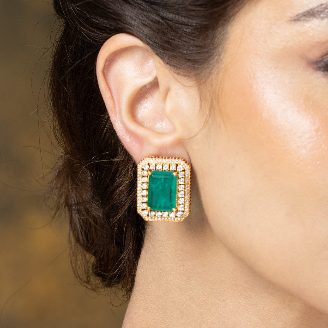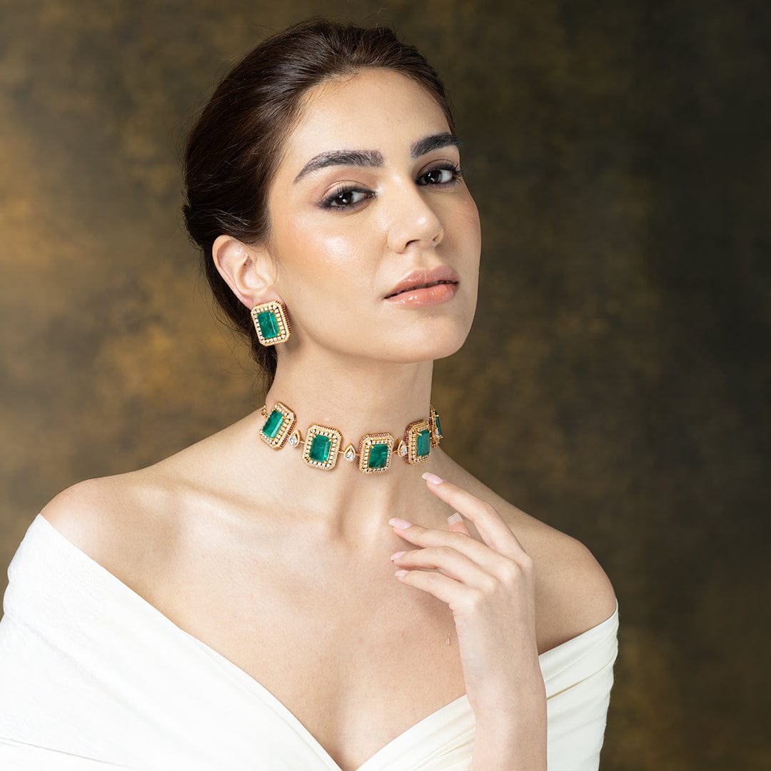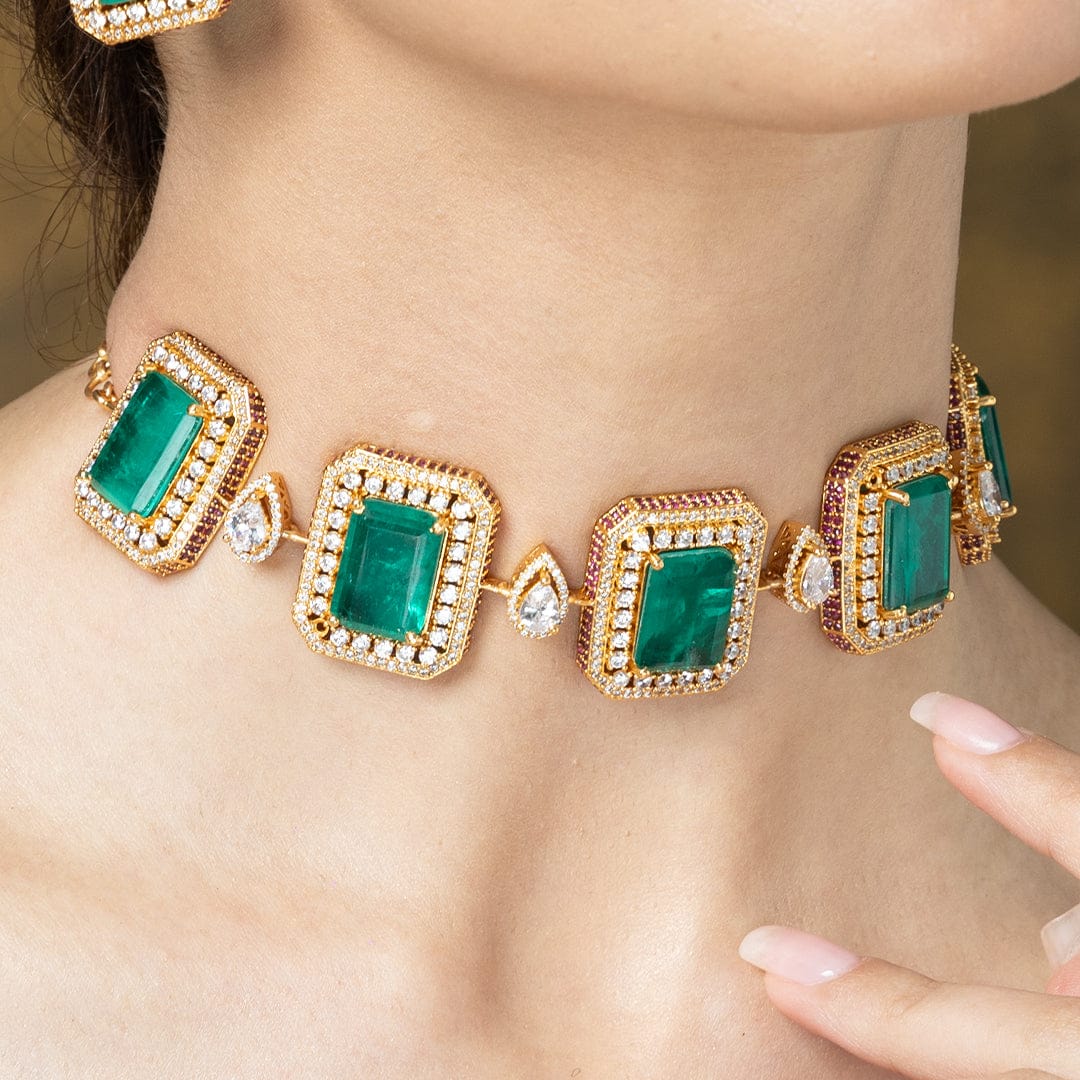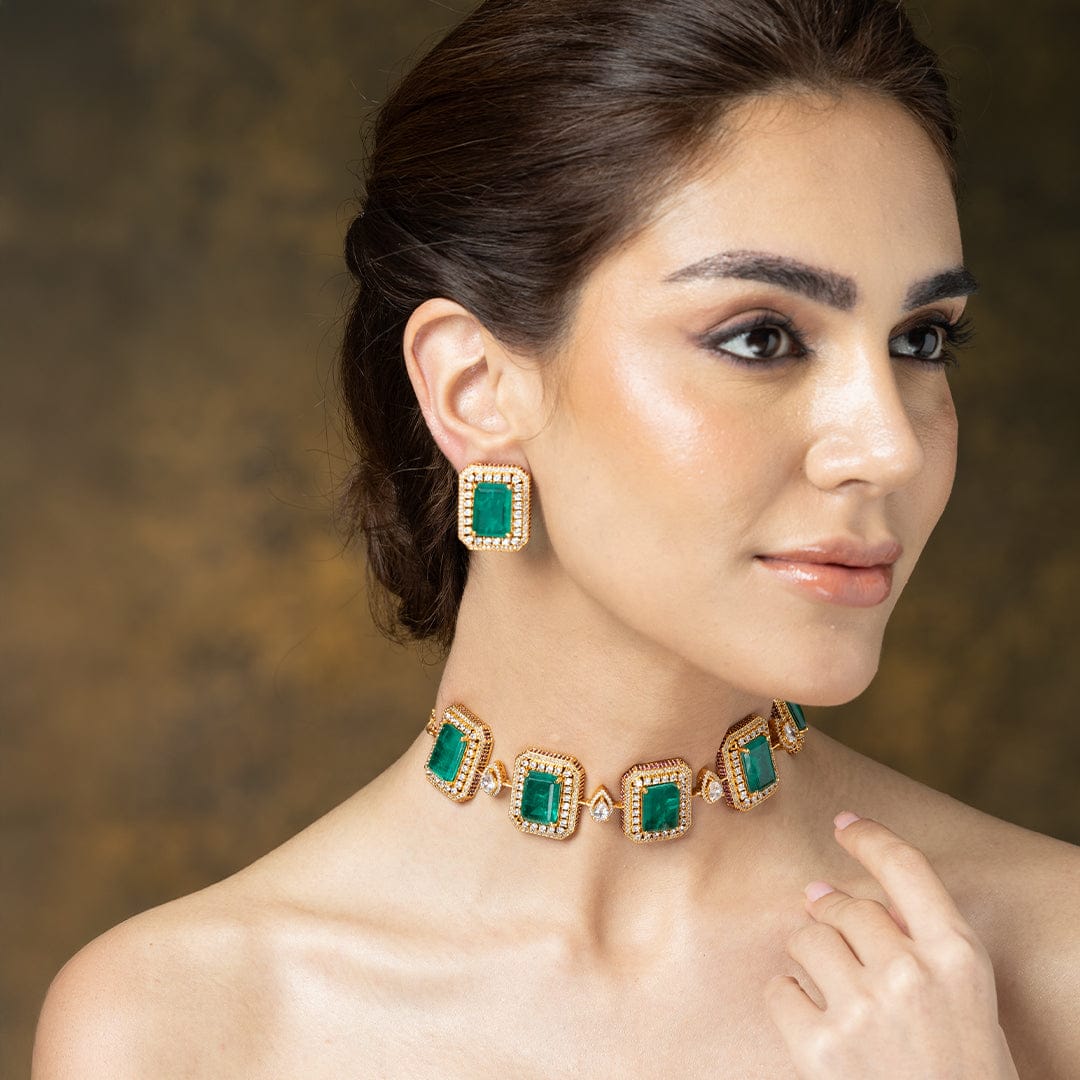 Regular price Rs. 12,600.00Description: Command attention with the striking beauty of this exquisite choker necklace set and matching stud earrings. The design features multiple bold, square-framed gems, interspersed with dazzling accent clusters, creating a truly magnificent display.