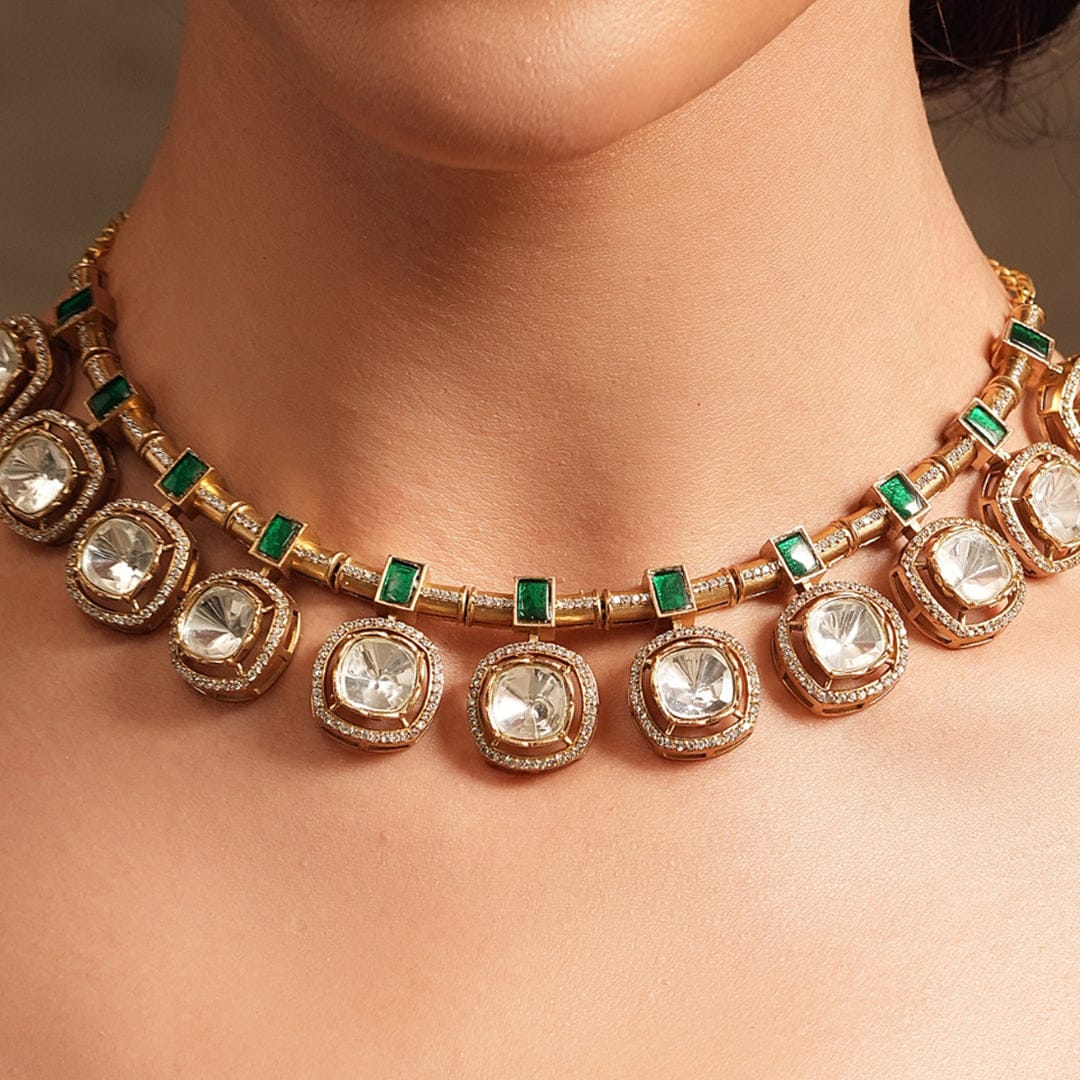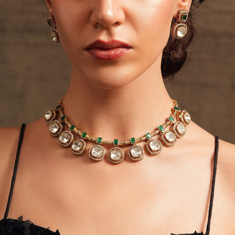Regular price Rs. 9,200.00Description: A perfect blend of classic charm and modern elegance, this Polki station drop hasli necklace set features carefully placed Polki stones along a sleek gold band. The delicate drops add a graceful touch to the design, making it an ideal statement piece for festive and formal occasions. Paired with matching earrings, this set is a timeless addition to your jewelry collection