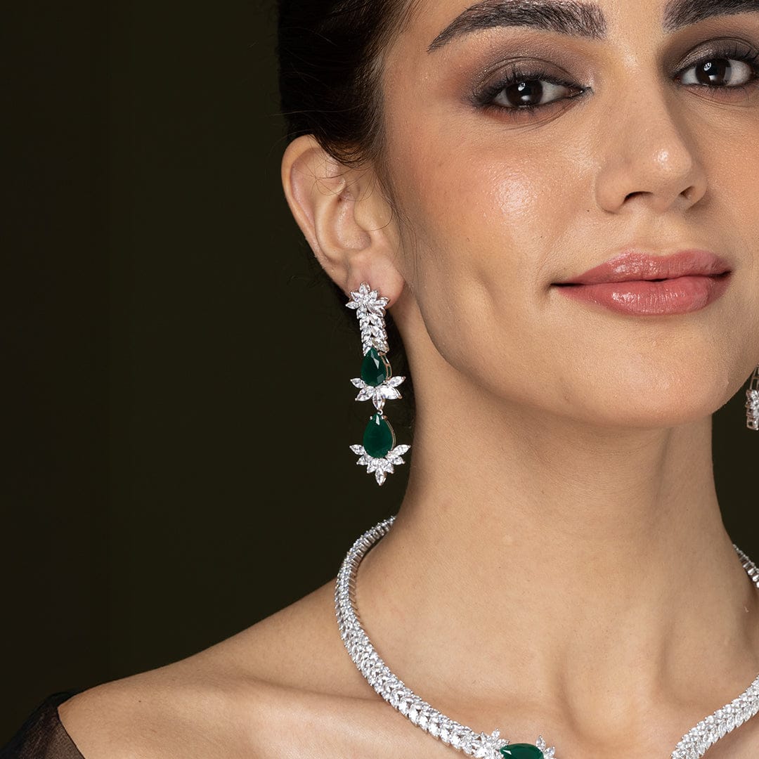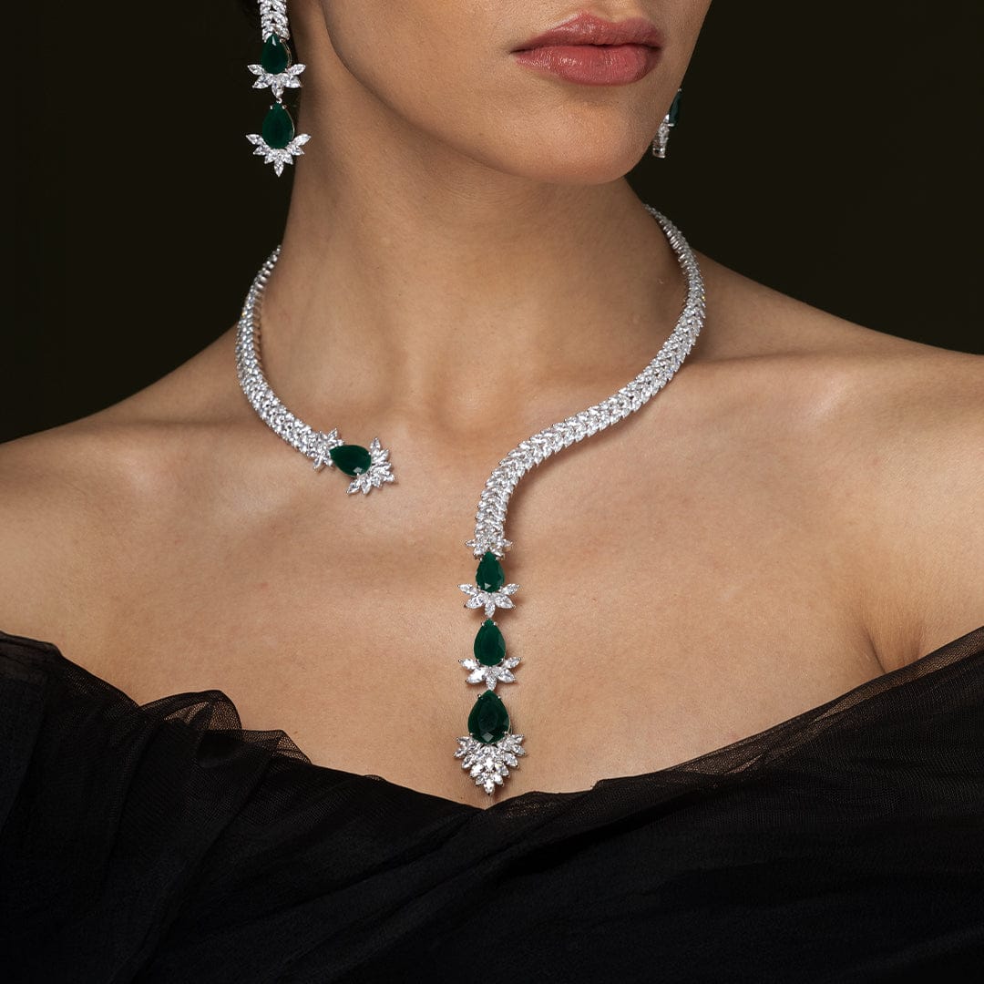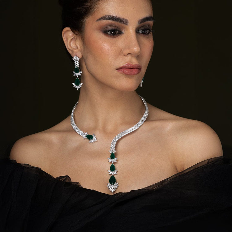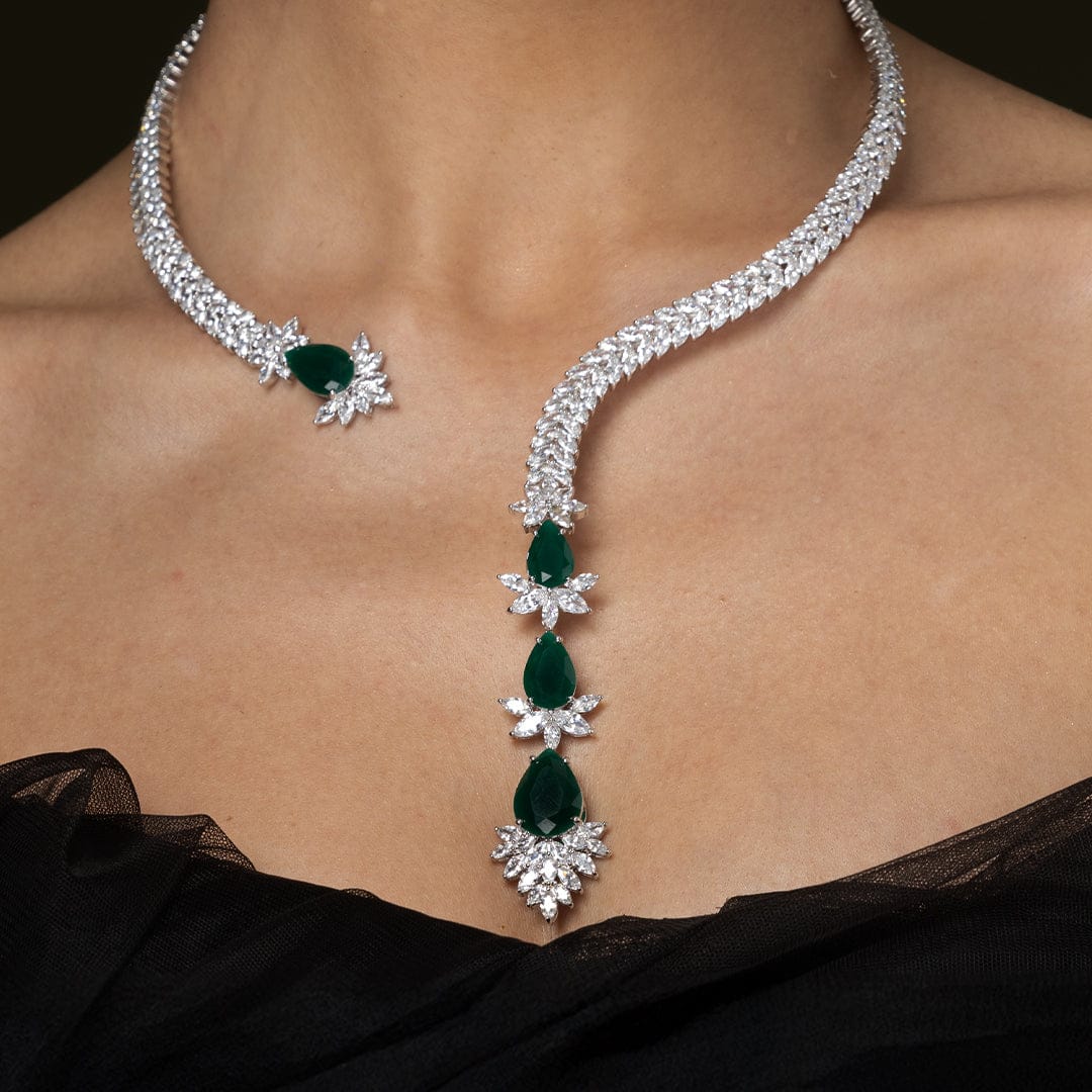 Regular price Rs. 26,780.00Description: This necklace set is a daring and luxurious set that coils around the neck with sophisticated glamour. The necklace ends in a graceful, asymmetrical drop, the "kiss" where a dazzling vertical cascade of deep emerald green teardrop stones plunges downward.