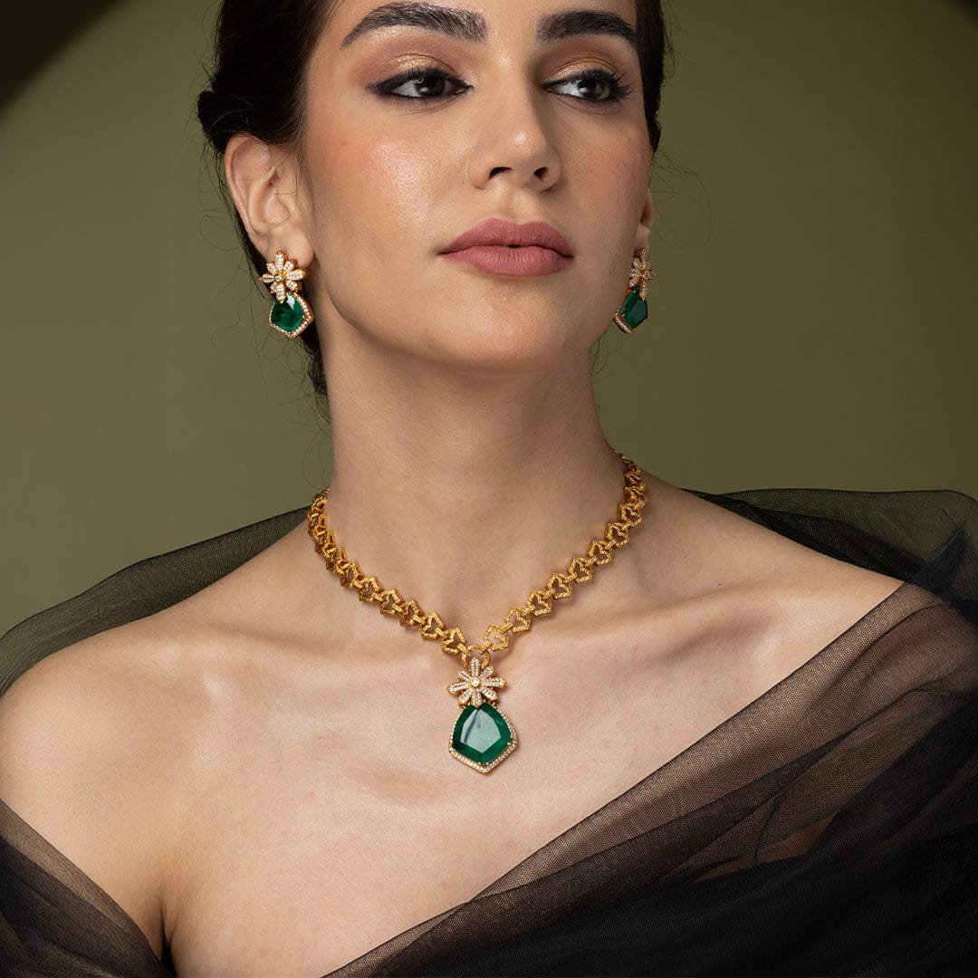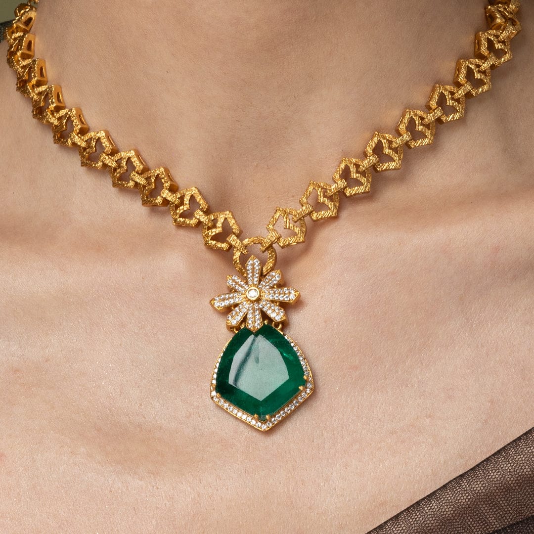 Regular price Rs. 6,000.00Description: An enchanting long necklace set featuring a unique heart-link chain and a large, rich green enamelled pendant. Complemented by delicate, floral-detailed matching drop earrings.