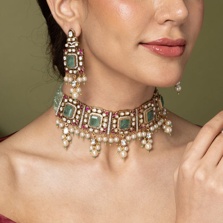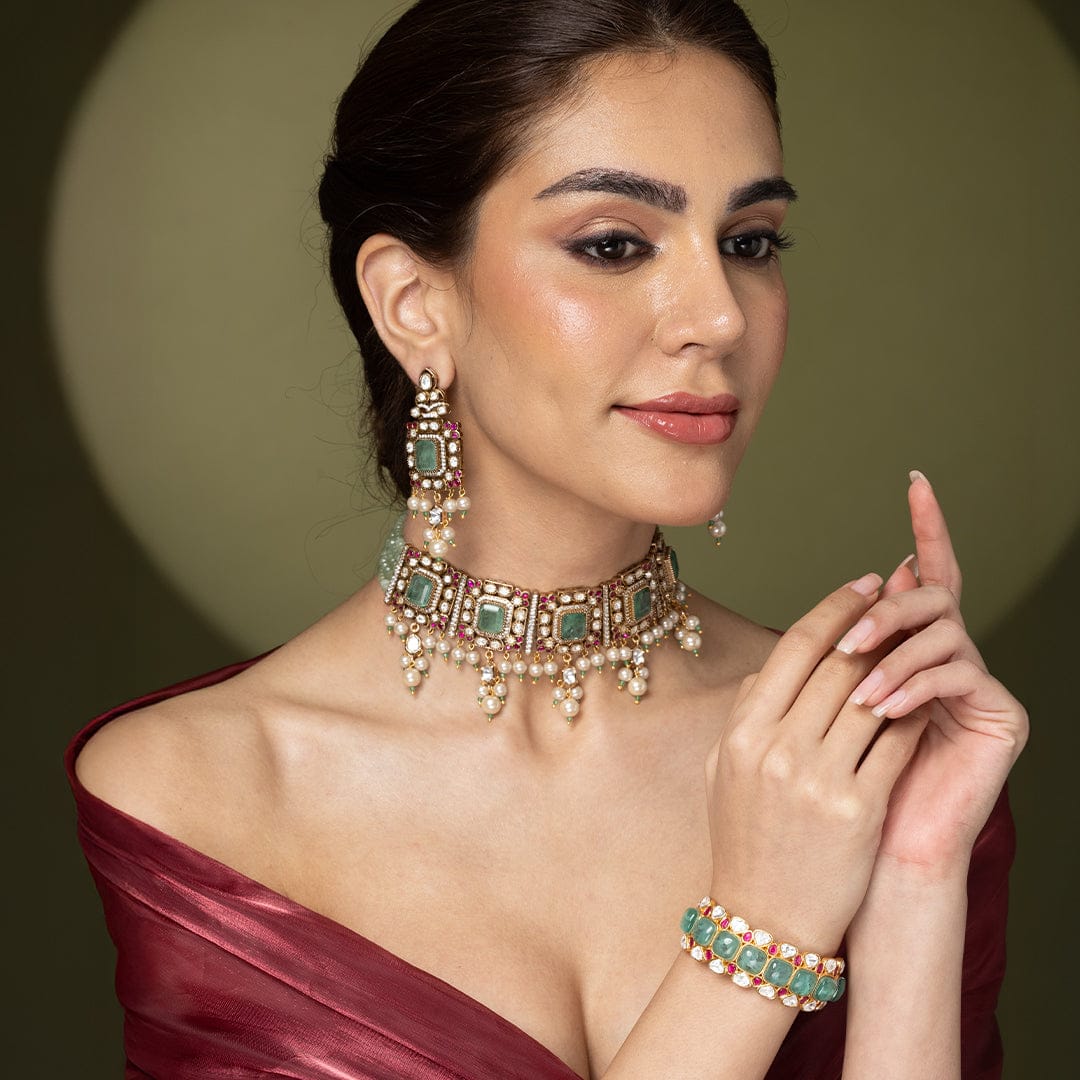 We use 22K Micron Gold Plating on brass, paired with high quality pearls, precious carved beads, semi precious stones, intricately hand painted with enamel, exquisite high quality pearls and high quality kundan that are celebrated for their durability and refinement - making every Joules by Radhika creation a piece that radiates brilliance and sophistication.
