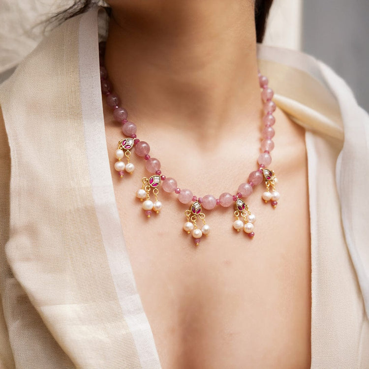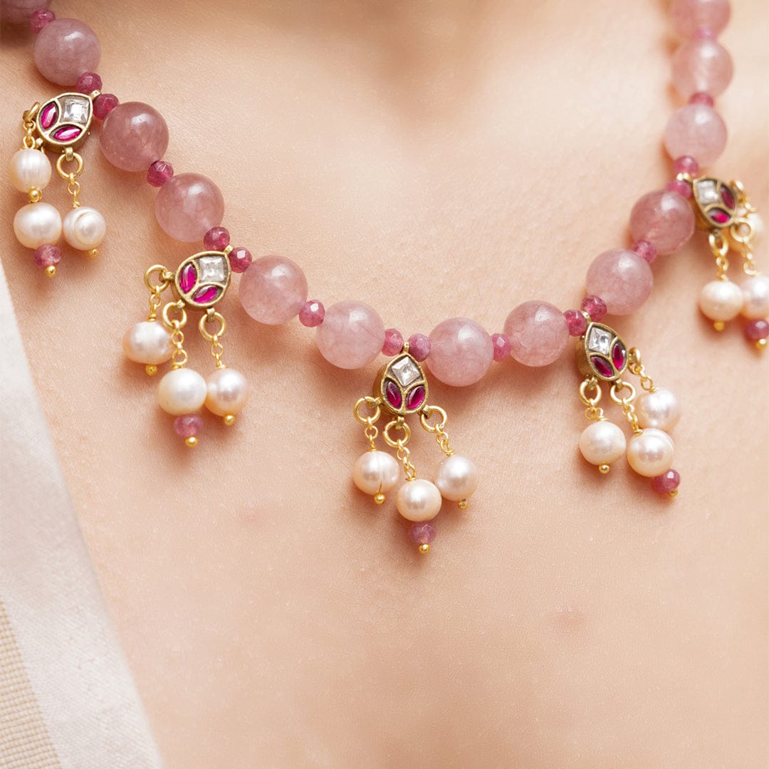 Regular price Rs. 3,400.00Description: A pastel pink necklace adorned with floral charms and pearl drops, radiating softness and femininity. A beautiful pick for bridesmaids or day-to-evening festive dressing.