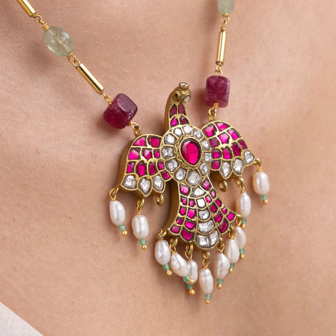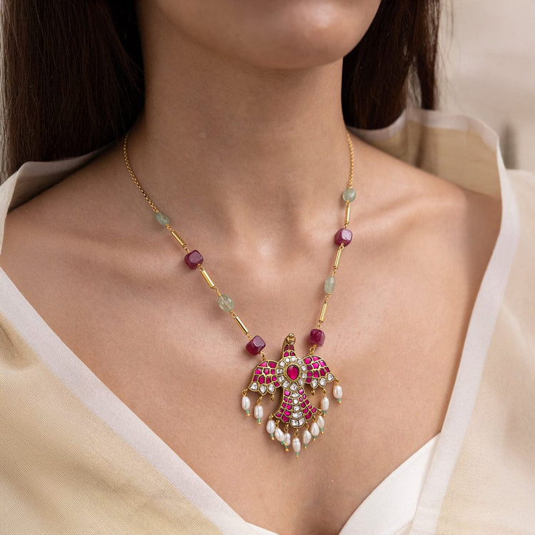 Regular price Rs. 7,120.00Description: A delicate yet statement-making necklace with ruby-toned stones, gold detailing, and layered drops that radiate phoenix artistry. This piece celebrates cultural heritage with youthful flair. Perfect for mehendi functions and festive evenings.
