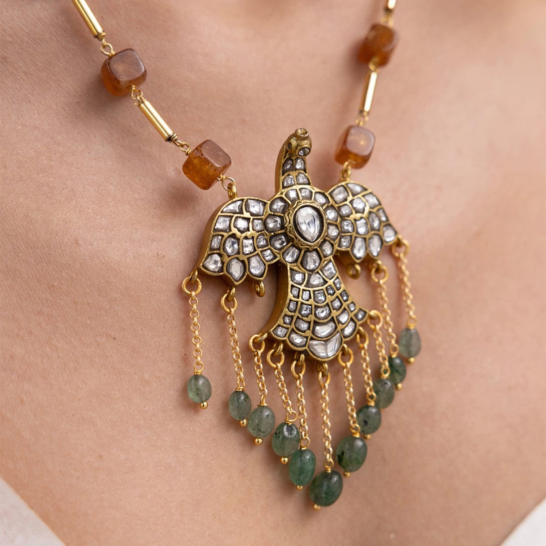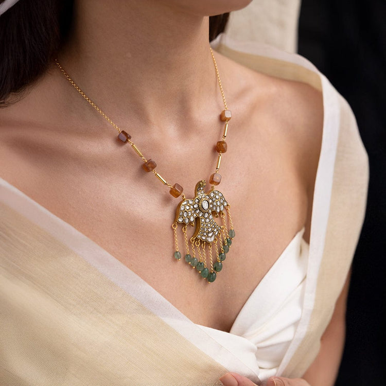 Regular price Rs. 7,120.00Description: This heritage-inspired necklace is a vision of ornate craftsmanship, with cascading beads, bird accent, and rhythmic fringe layers. Every element whispers a tale of cultural richness, making it perfect for wedding rituals or heirloom showcases.